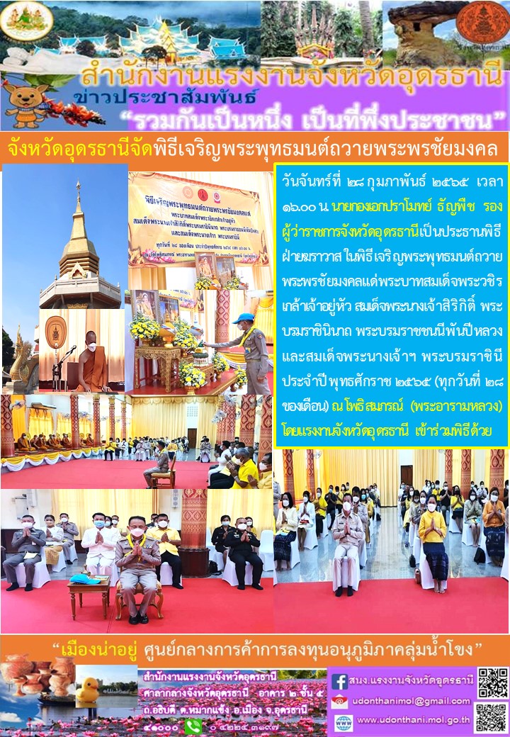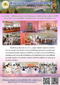 แรงงานจังหวัดตาก ร่วมพิธีเจริญพระพุทธมนต์ถวายพระพรชัยมงคลแด่พระบาทสมเด็จพระเจ้าอยู่หัว สมเด็จพระนางเจ้าสิริกิติ์ พระบรมราชินีนาถ พระบรมราชชนนีพันปีหลวง และสมเด็จพระนางเจ้าฯ พระบรมราชินี ประจำปีพุทธศักราช 2565