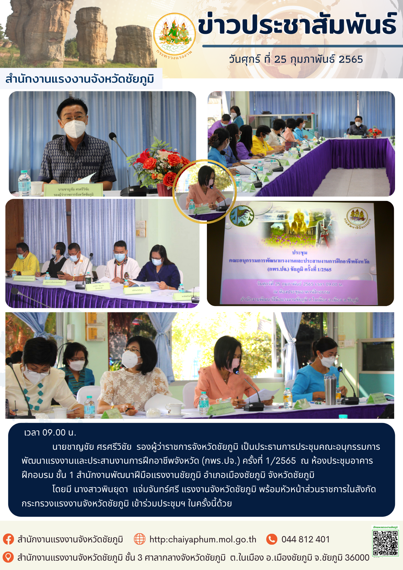 รองผู้ว่าราชการจังหวัดชัยภูมิ เป็นประธานการประชุมคณะอนุกรรมการพัฒนาแรงงานและประสานงานการฝึกอาชีพจังหวัด (กพร.ปจ.) ครั้งที่ 1/2565