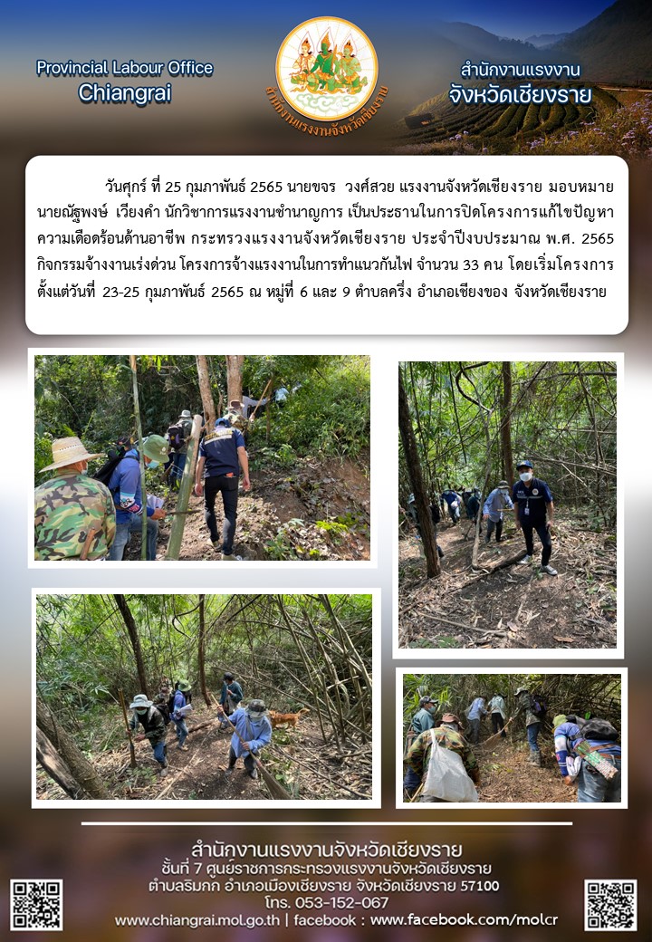 สรจ.ชร. เป็นประธานในการปิดโครงการแก้ไขปัญหาความเดือดร้อนด้านอาชีพ กระทรวงแรงงานจังหวัดเชียงราย ประจำปีงบประมาณ พ.ศ. 2565 กิจกรรมจ้างงานเร่งด่วน โครงการจ้างแรงงานในการทำแนวกันไฟ