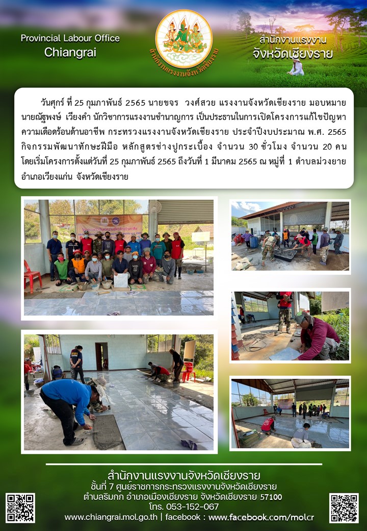 สรจ.ชร. เป็นประธานในการเปิดโครงการแก้ไขปัญหาความเดือดร้อนด้านอาชีพ กระทรวงแรงงานจังหวัดเชียงราย ประจำปีงบประมาณ พ.ศ. 2565 กิจกรรมพัฒนาทักษะฝีมือ หลักสูตรช่างปูกระเบื้อง