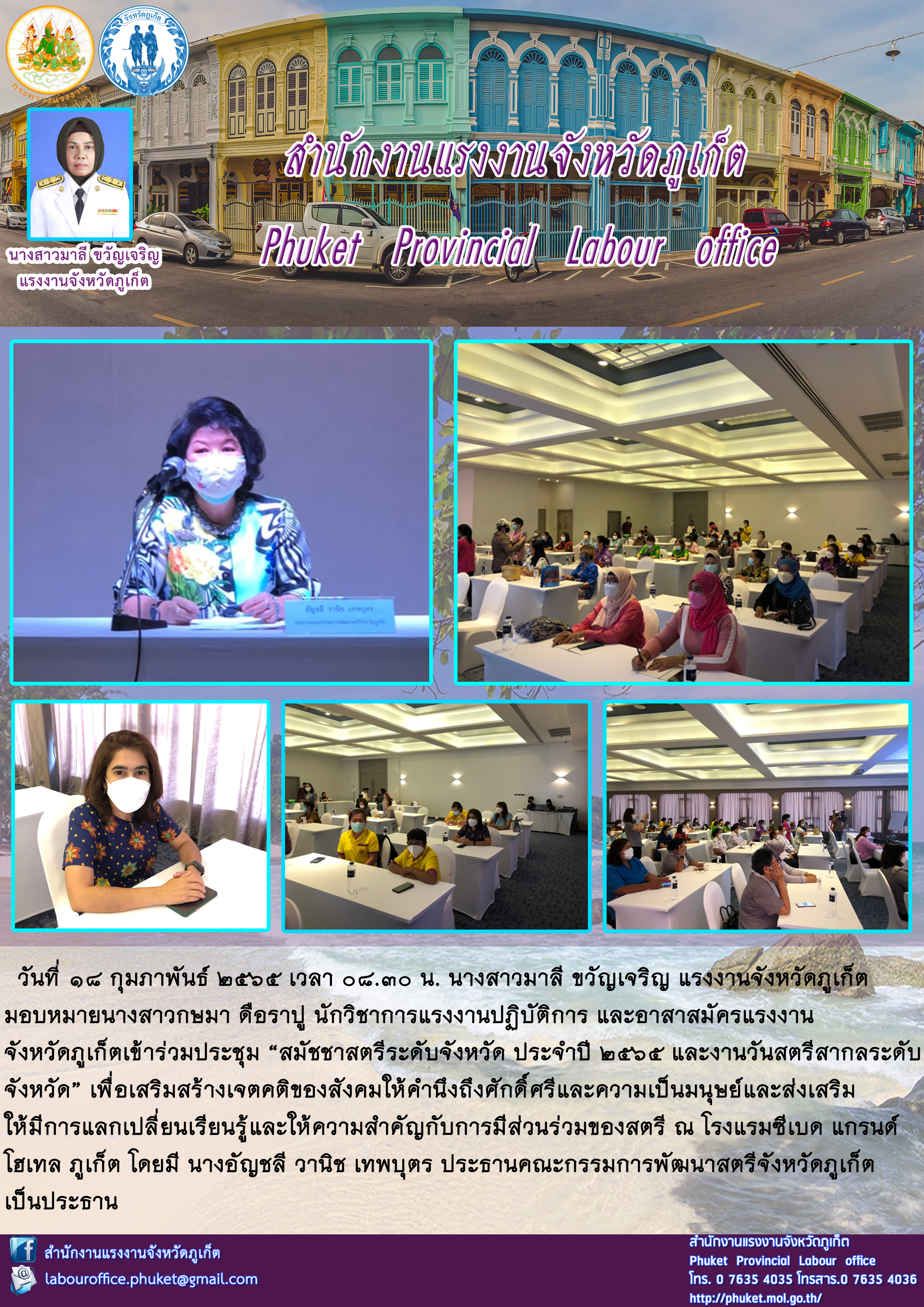 นางสาวมาลี ขวัญเจริญ แรงงานจังหวัดภูเก็ต มอบหมายนางสาวกษมา ดือราปู นักวิชาการแรงงานปฏิบัติการ และอาสาสมัครแรงงาน จังหวัดภูเก็ตเข้าร่วมประชุม “สมัชชาสตรีระดับจังหวัด ประจำปี 2565 และงานวันสตรีสากลระดับ จังหวัด”