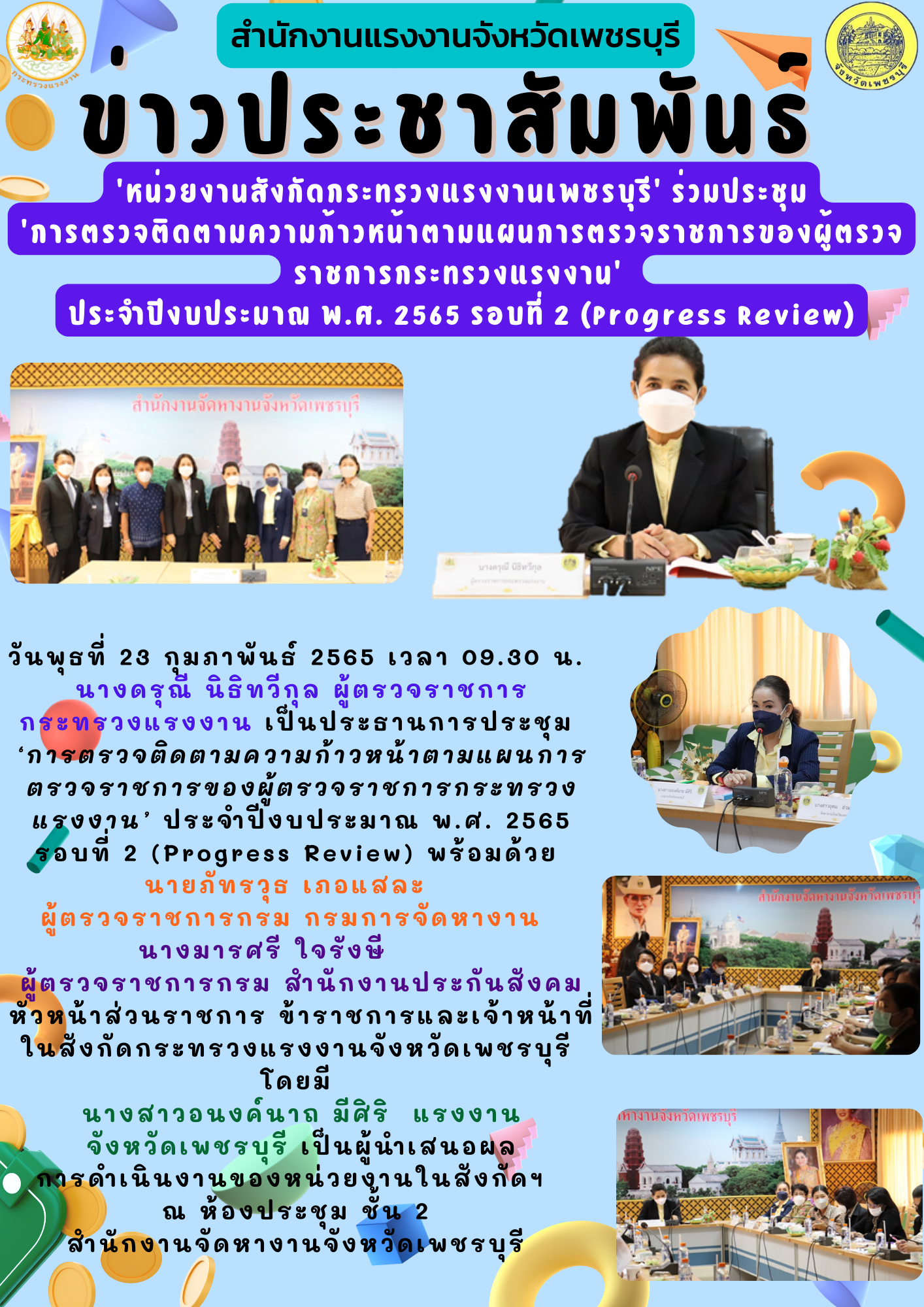 ‘หน่วยงานสังกัดกระทรวงแรงงานเพชรบุรี’ ร่วมประชุม ‘การตรวจติดตามความก้าวหน้าตามแผนการตรวจราชการของผู้ตรวจราชการกระทรวงแรงงาน’ ประจำปีงบประมาณ พ.ศ. 2565 รอบที่ 2 (Progress Review)