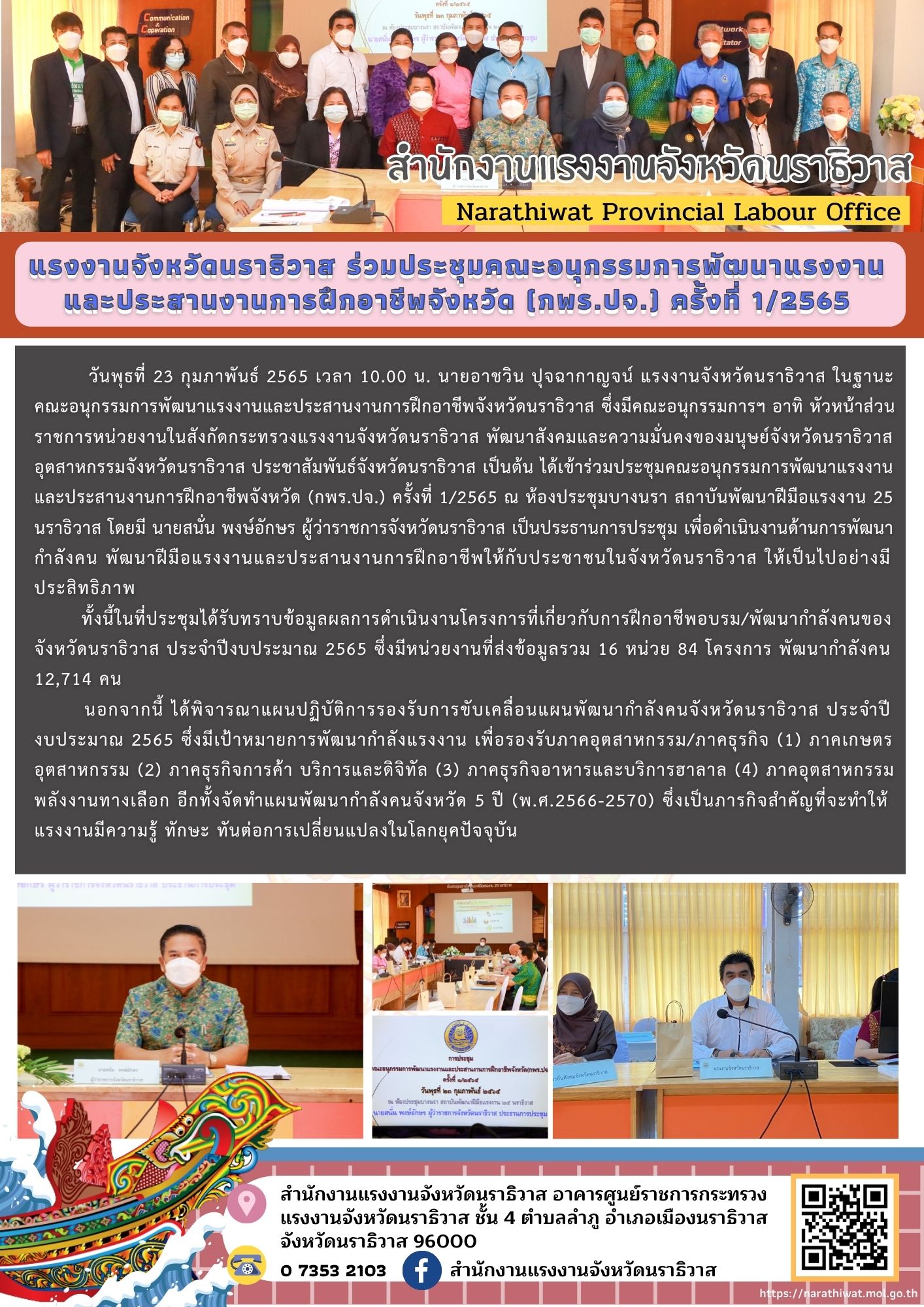 แรงงานจังหวัดนราธิวาส ร่วมประชุมคณะอนุกรรมการพัฒนาแรงงานและประสานงานการฝึกอาชีพจังหวัด (กพร.ปจ.) ครั้งที่ 1/2565