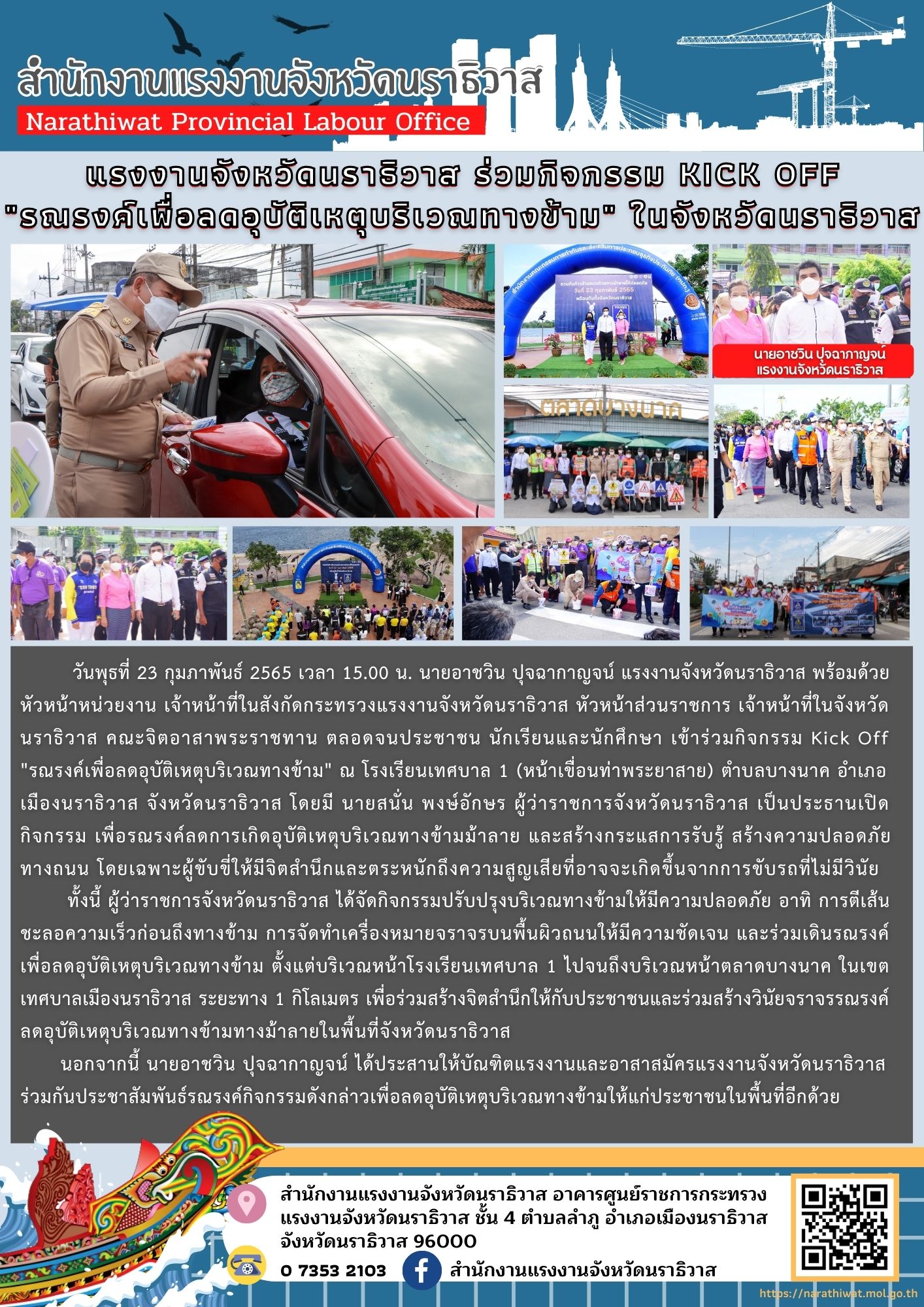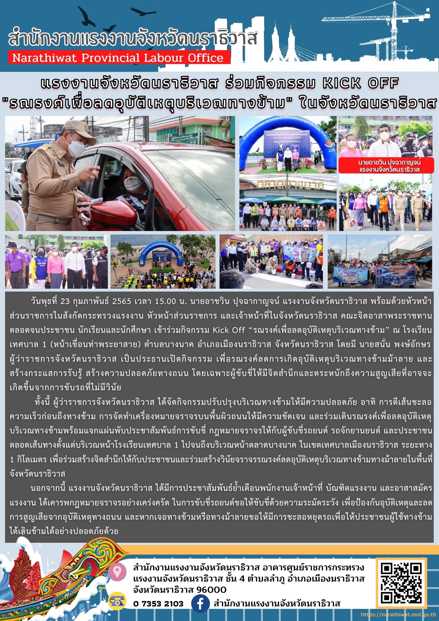 แรงงานจังหวัดนราธิวาส ร่วมกิจกรรม Kick Off “รณรงค์เพื่อลดอุบัติเหตุบริเวณทางข้าม” ในจังหวัดนราธิวาส