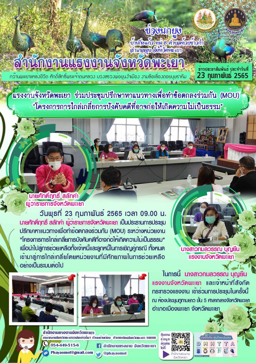 แรงงานจังหวัดพะเยา ร่วมประชุมปรึกษาหาแนวทางเพื่อทำข้อตกลงร่วมกัน (MOU) “โครงการการไกล่เกลี่ยการบังคับคดีที่อาจก่อให้เกิดความไม่เป็นธรรม”