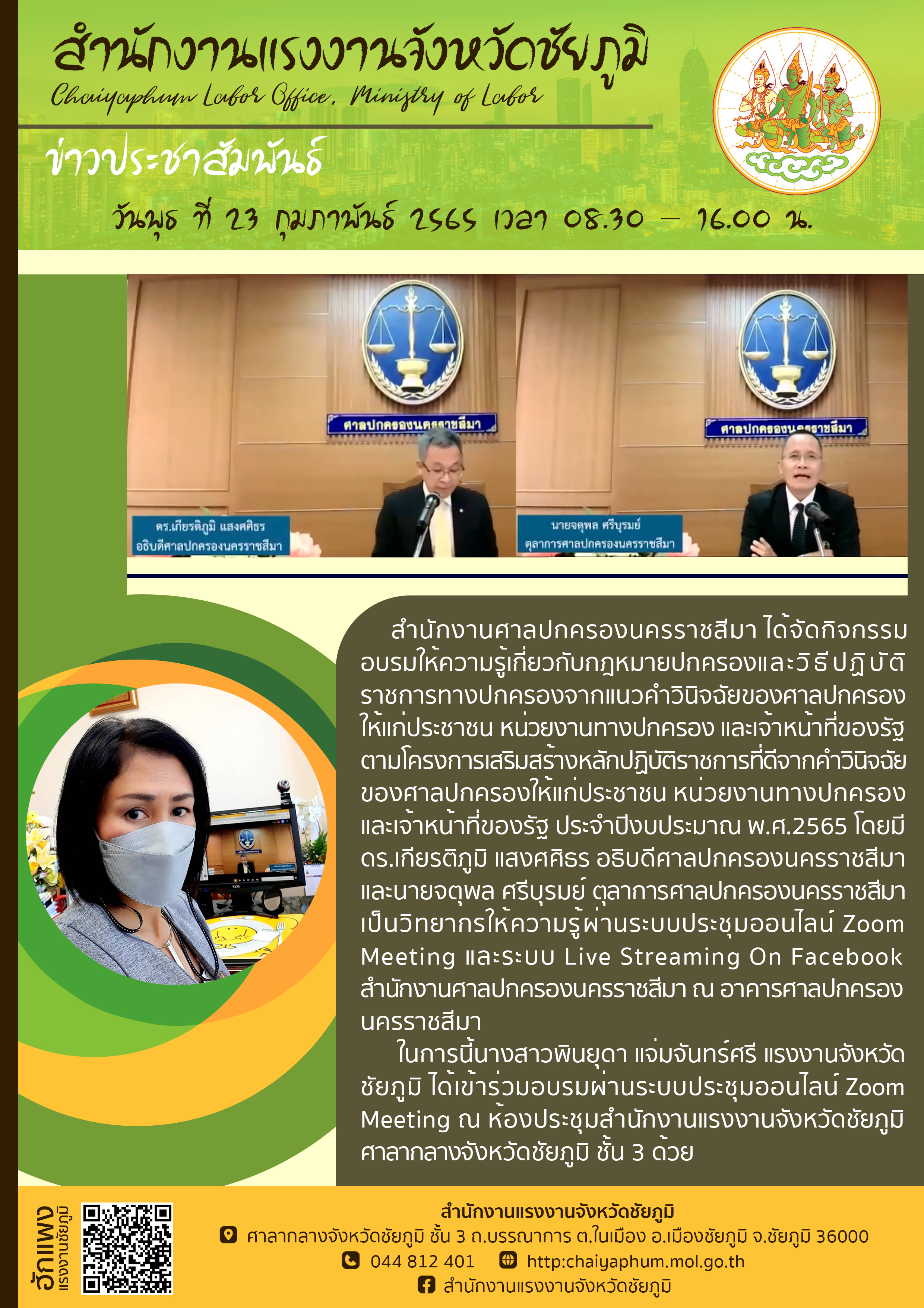 แรงงานจังหวัดชัยภูมิ เข้าร่วมอบรมเกี่ยวกับกฎหมายปกครองและวิธีปฏิบัติราชการทางปกครองจากแนวคำวินิจฉัยของศาลปกครองฯ