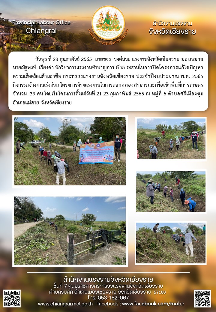 สรจ.ชร. เป็นประธานในการปิดโครงการแก้ไขปัญหาความเดือดร้อนด้านอาชีพ กระทรวงแรงงานจังหวัดเชียงราย ประจำปีงบประมาณ พ.ศ. 2565 กิจกรรมจ้างงานเร่งด่วน โครงการจ้างแรงงานในการลอกคลองสาธารณะเพื่อเข้าพื้นที่การเกษตร