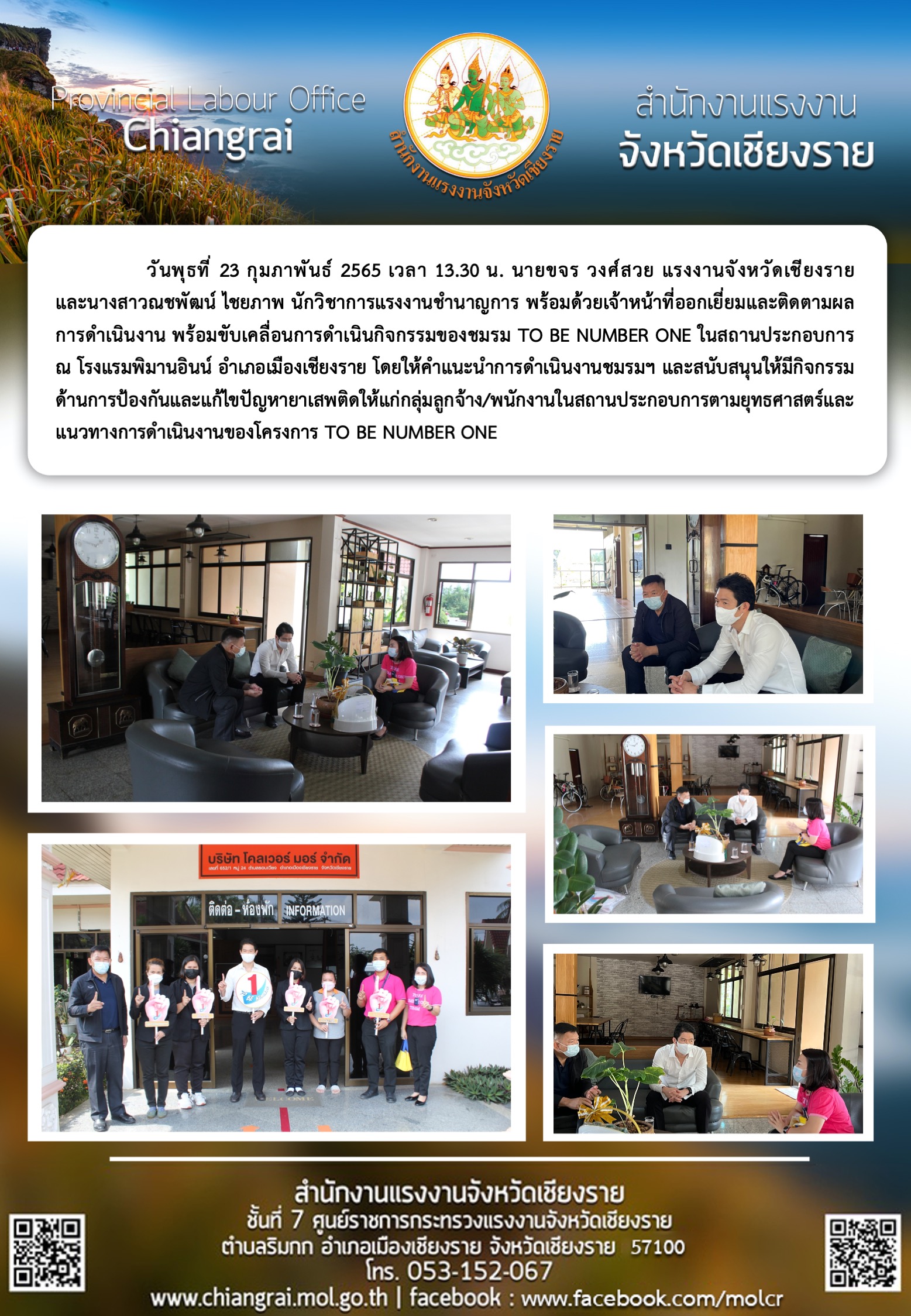 สรจ.ชร. ออกเยี่ยมและติดตามผลการดำเนินงาน พร้อมขับเคลื่อนการดำเนินกิจกรรมของชมรม TO BE NUMBER ONE ในสถานประกอบการ ณ โรงแรมพิมานอินน์ อำเภอเมืองเชียงราย