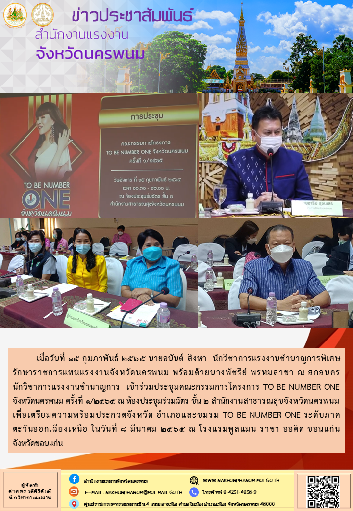 สำนักงานแรงงานจังหวัดนครพนม เข้าร่วมประชุมคณะกรรมการโครงการ TO BE NUMBER ONE จังหวัดนครพนม ครั้งที่ 1/2565