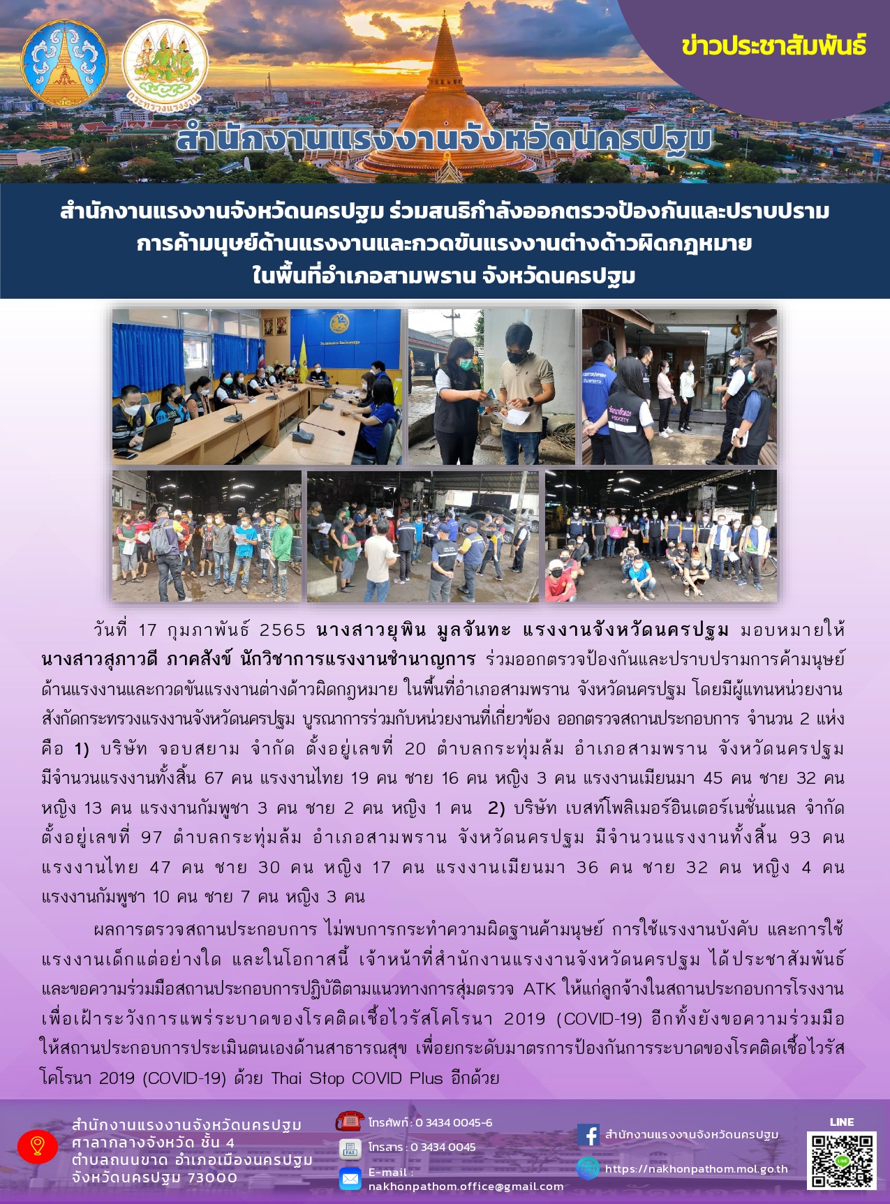 สำนักงานแรงงานจังหวัดนครปฐม ร่วมสนธิกำลังออกตรวจป้องกันและปราบปรามการค้ามนุษย์ด้านแรงงานและกวดขันแรงงานต่างด้าวผิดกฎหมาย ในพื้นที่อำเภอสามพราน จังหวัดนครปฐม