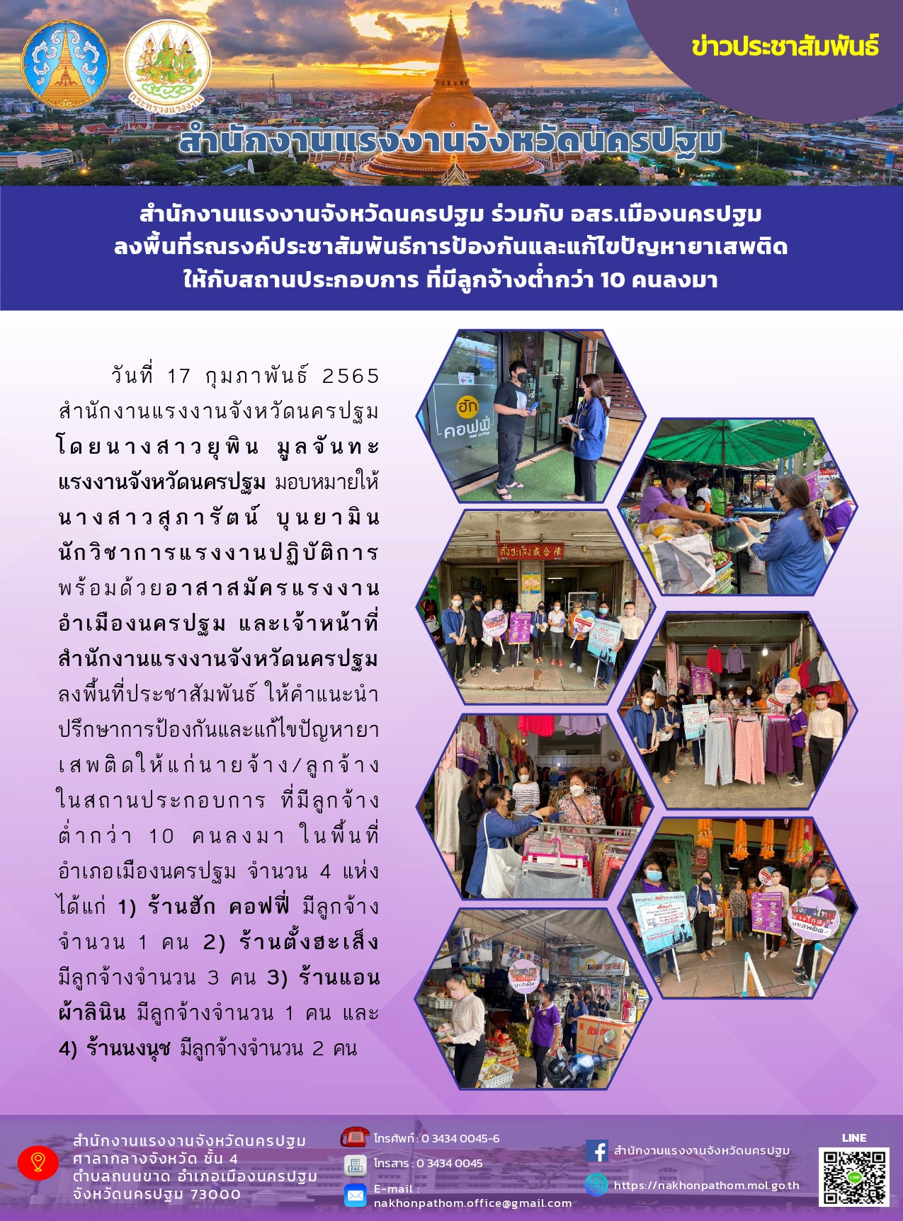 สำนักงานแรงงานจังหวัดนครปฐม ร่วมกับ อสร.เมืองนครปฐม ลงพื้นที่รณรงค์ประชาสัมพันธ์การป้องกันและแก้ไขปัญหายาเสพติดให้กับสถานประกอบการ ที่มีลูกจ้างต่ำกว่า 10 คนลงมา