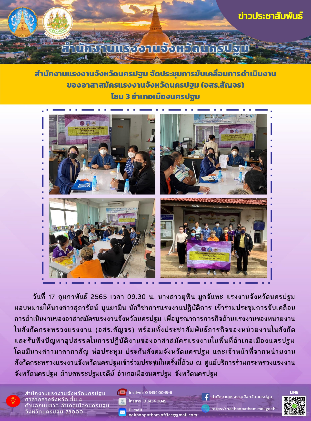 สำนักงานแรงงานจังหวัดนครปฐม จัดประชุมการขับเคลื่อนการดำเนินงานของอาสาสมัครแรงงานจังหวัดนครปฐม (อสร.สัญจร) โซน 3 อำเภอเมืองนครปฐม