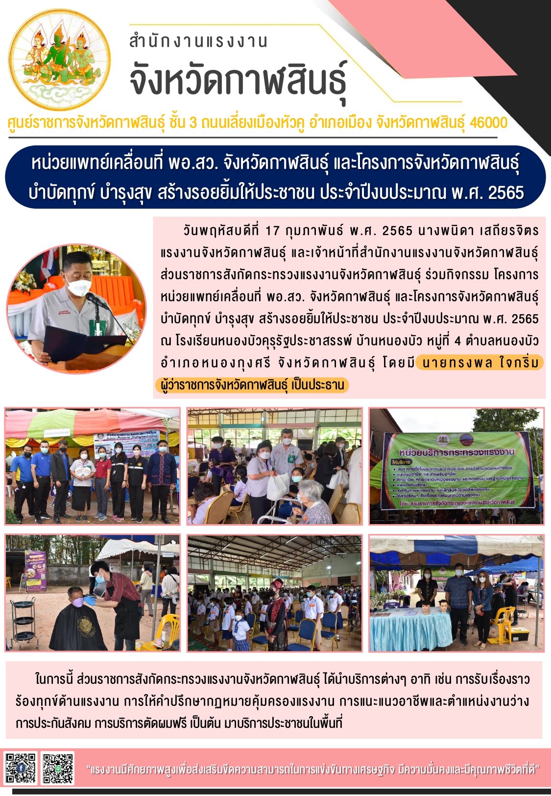 หน่วยแพทย์เคลื่อนที่ พอ.สว. จังหวัดกาฬสินธุ์ และโครงการจังหวัดกาฬสินธุ์ บำบัดทุกข์ บำรุงสุข สร้างรอยยิ้มให้ประชาชน ประจำปีงบประมาณ พ.ศ. 2565