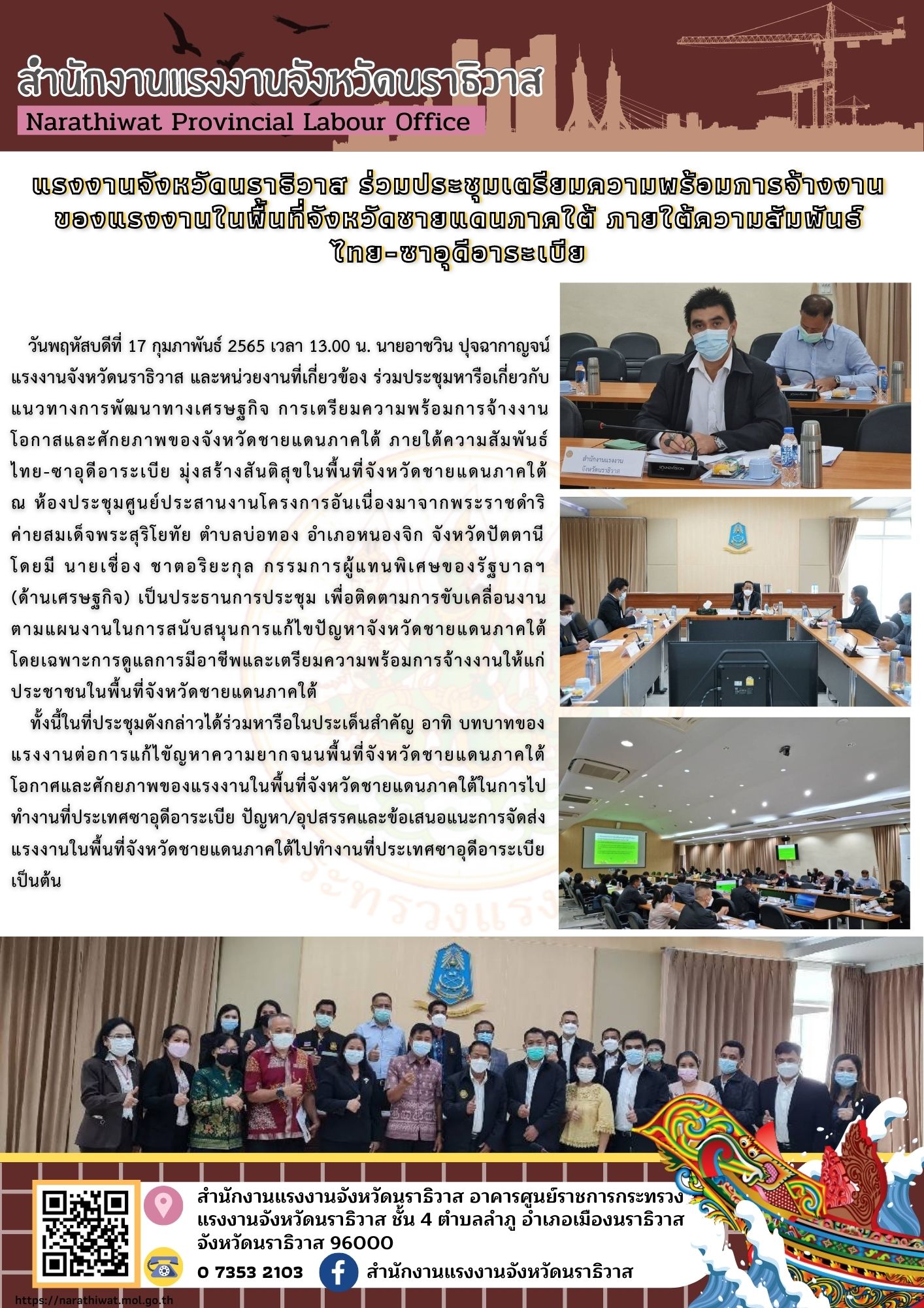 แรงงานจังหวัดนราธิวาส ร่วมประชุมเตรียมความพร้อมการจ้างงานของแรงงานในพื้นที่จังหวัดชายแดนภาคใต้ ภายใต้ความสัมพันธ์ ไทย-ซาอุดีอาระเบีย