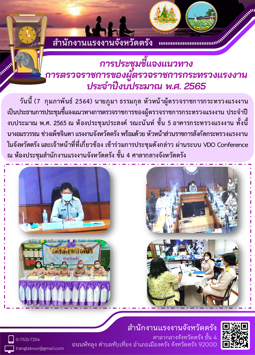 แรงงานจังหวัดตรัง พร้อมด้วย หัวหน้าส่วนราชการสังกัดกระทรวงแรงงานในจังหวัดตรัง และเจ้าหน้าที่ที่เกี่ยวข้อง เข้าร่วมการประชุมชี้แจงแนวทางการตรวจราชการของผู้ตรวจราชการกระทรวงแรงงาน ประจำปีงบประมาณ พ.ศ. 2565