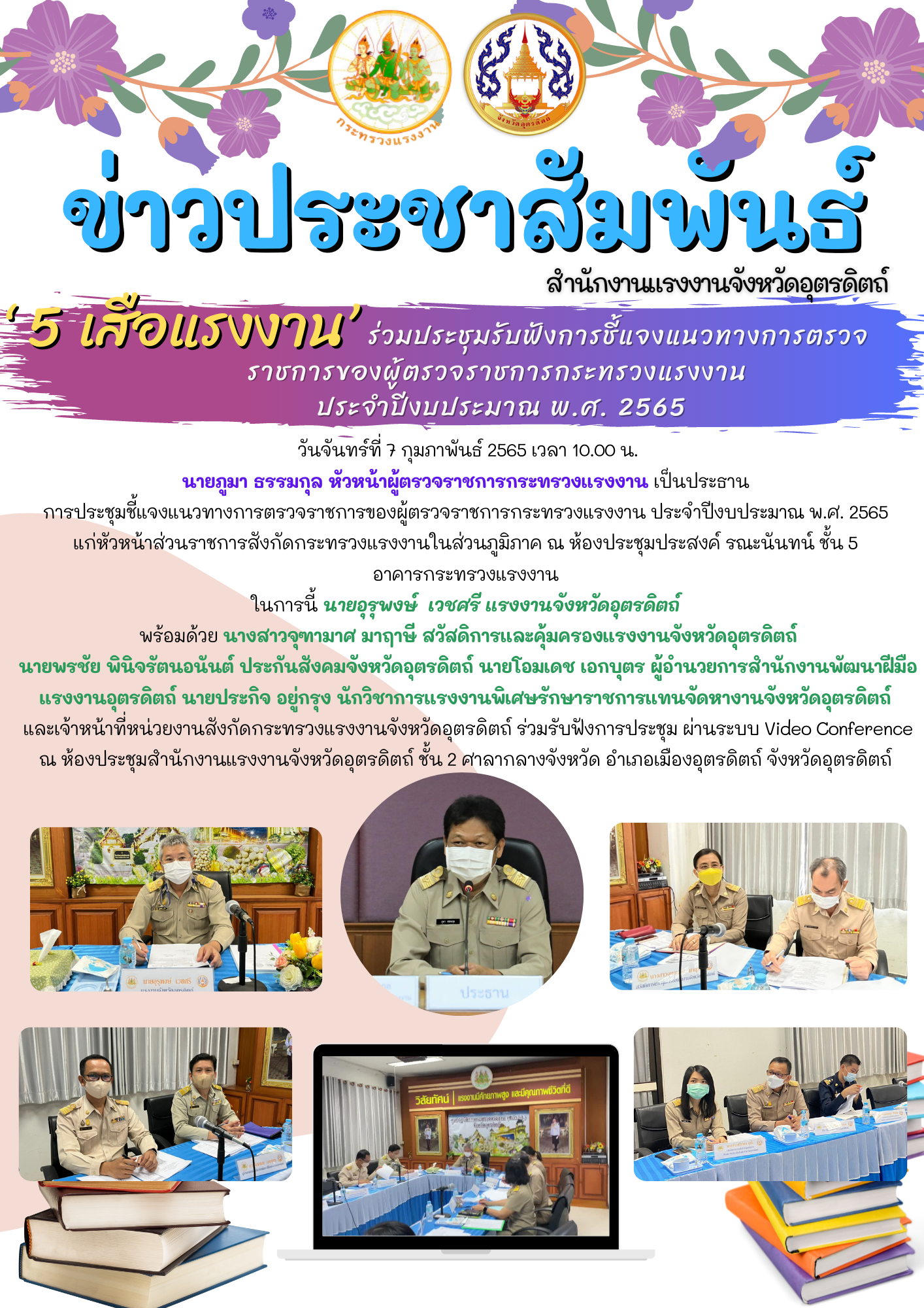 5 เสือแรงงาน พร้อมด้วยเจ้าหน้าทีที่รับผิดชอบการตรวจราชการ ร่วมการประชุมชี้แจงแนวทางการตรวจราชการของผู้ตรวจราชการกระทรวงแรงงาน ประจำปีงบประมาณ พ.ศ. 2565 รอบที่ 1 (Project Review)