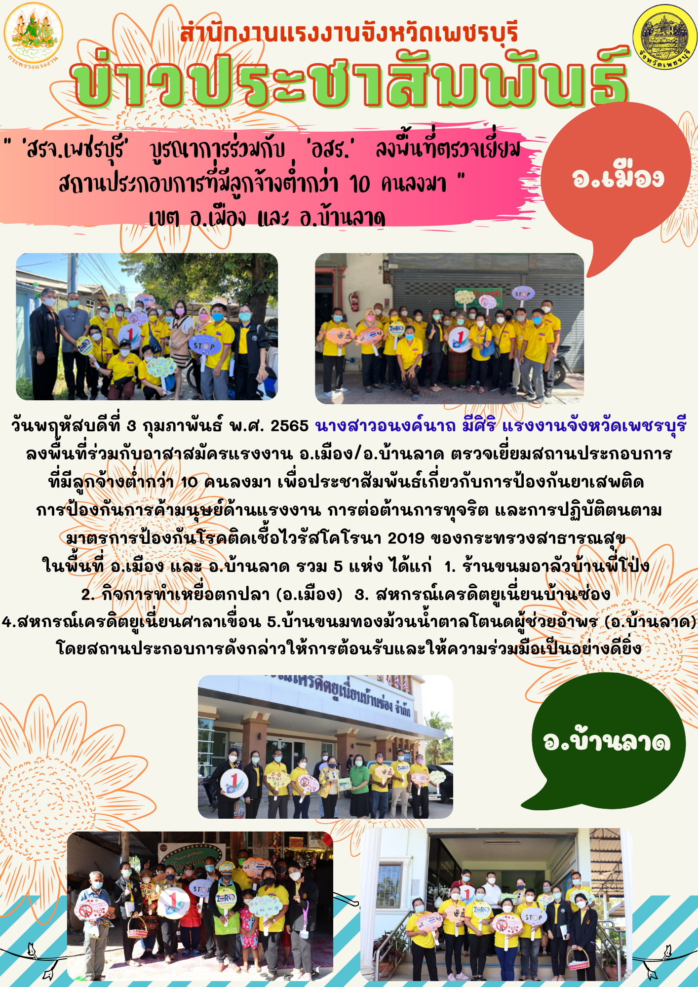 ‘สรจ.เพชรบุรี’ บูรณาการร่วมกับ ‘อสร.’ ลงพื้นที่ตรวจเยี่ยมสถานประกอบการที่มีลูกจ้างต่ำกว่า 10 คนลงมา เขต อ.เมือง และ อ.บ้านลาด