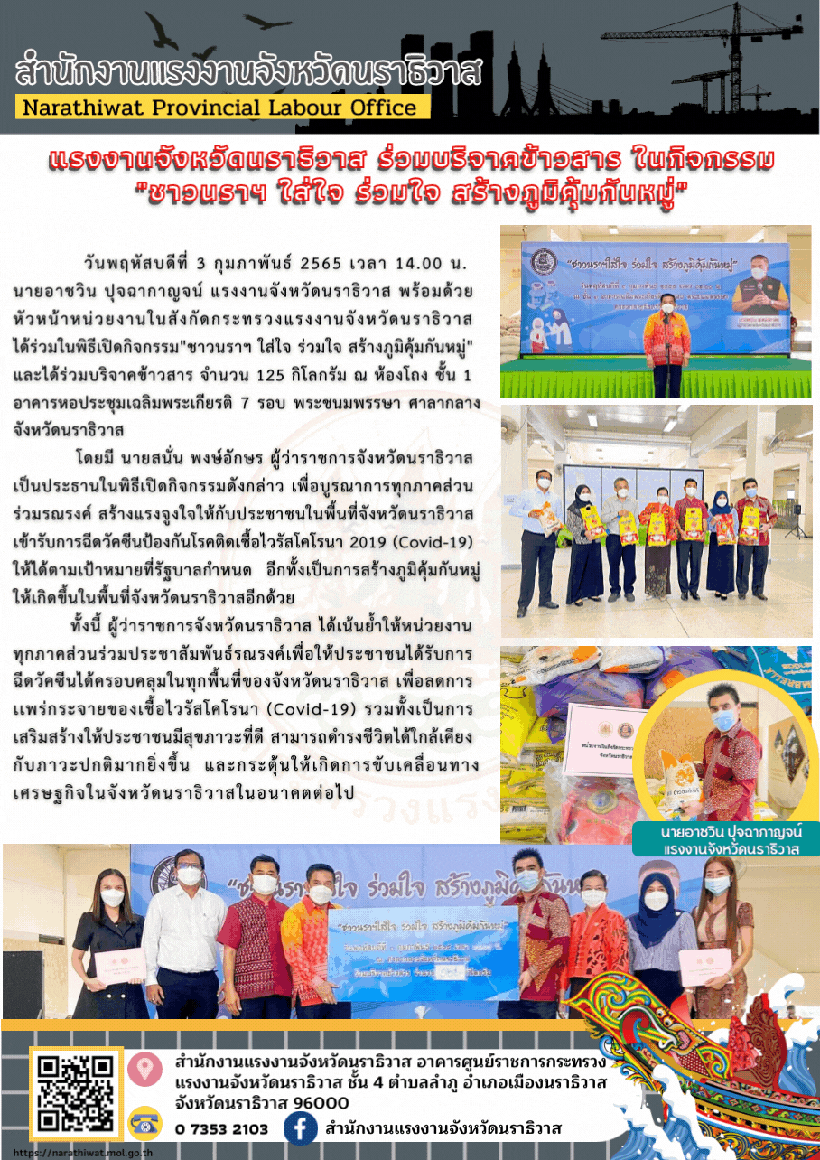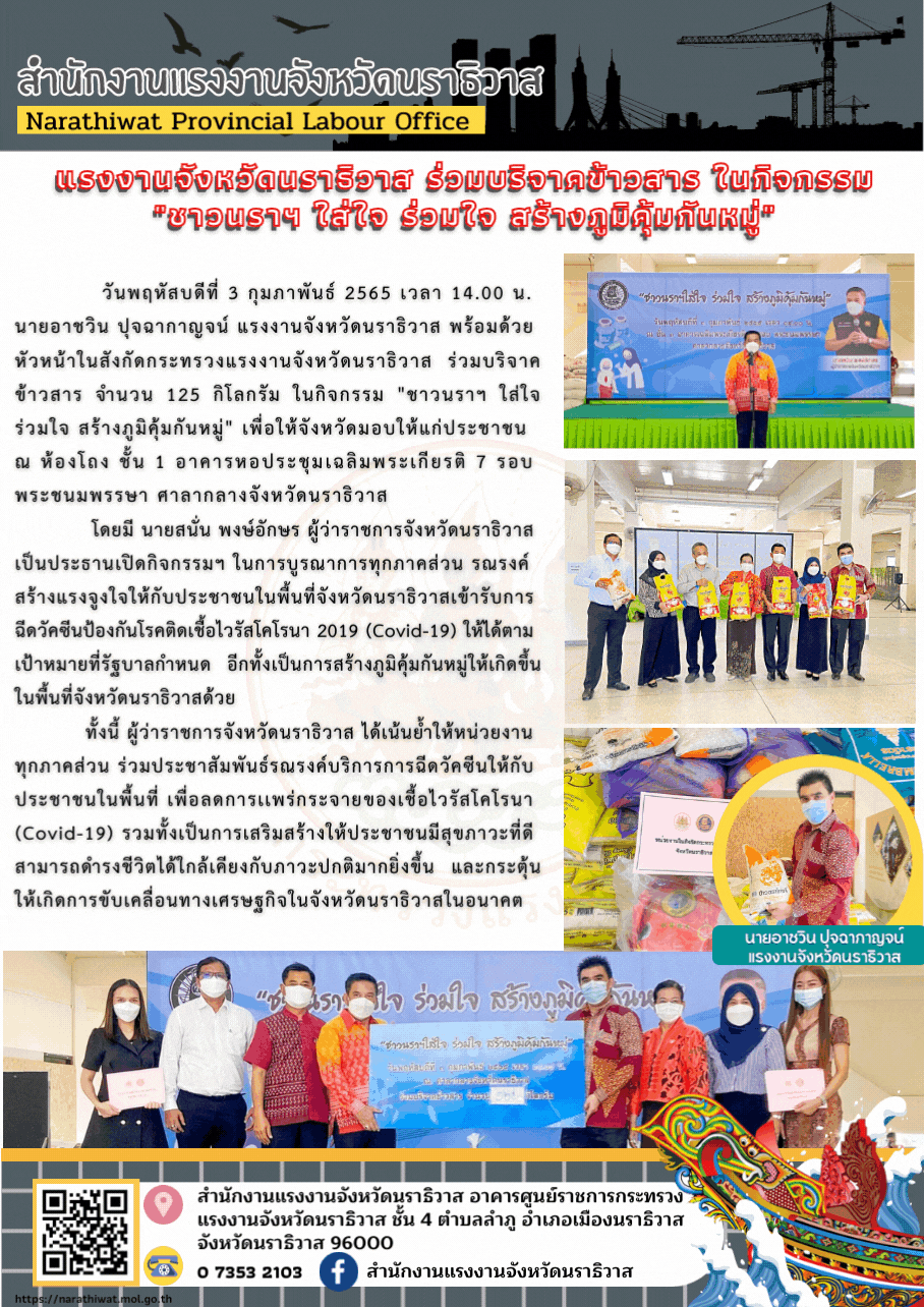 แรงงานจังหวัดนราธิวาส ร่วมบริจาคข้าวสารในกิจกรรม “ชาวนราฯ ใส่ใจ ร่วมใจ สร้างภูมิคุ้มกันหมู่”