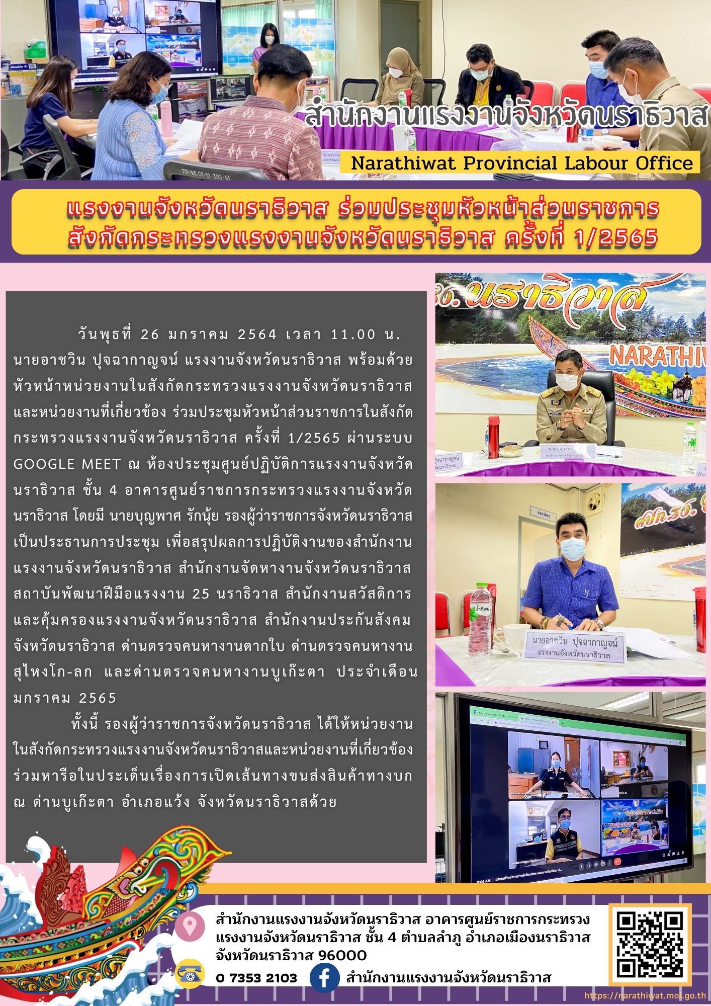 แรงงานจังหวัดนราธิวาส ร่วมประชุมหัวหน้าส่วนราชการสังกัดกระทรวงแรงงานจังหวัดนราธิวาส ครั้งที่ 1/2565