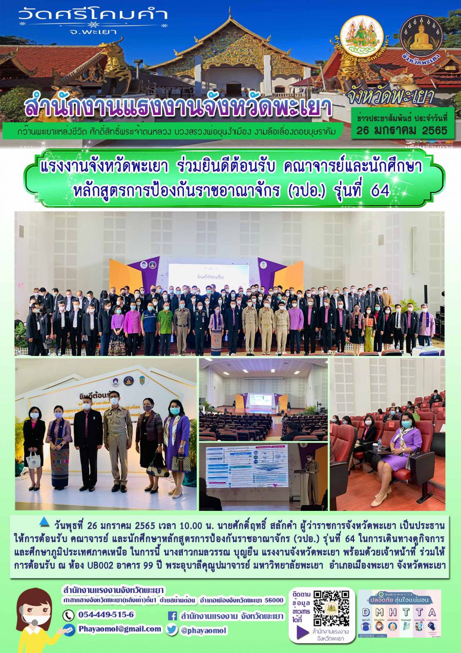แรงงานจังหวัดพะเยา ร่วมต้อนรับ คณาจารย์ และนักศึกษาหลักสูตรการป้องกันราชอาณาจักร (วปอ.) รุ่นที่ 64