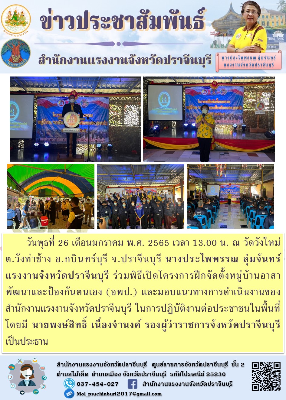 แรงงานจังหวัดปราจีนบุรี ร่วมพิธีเปิดโครงการฝึกจัดตั้งหมู่บ้านอาสาพัฒนาและป้องกันตนเอง (อพป.) และมอบแนวทางการดำเนินงานของสำนักงานแรงงานจังหวัดปราจีนบุรี