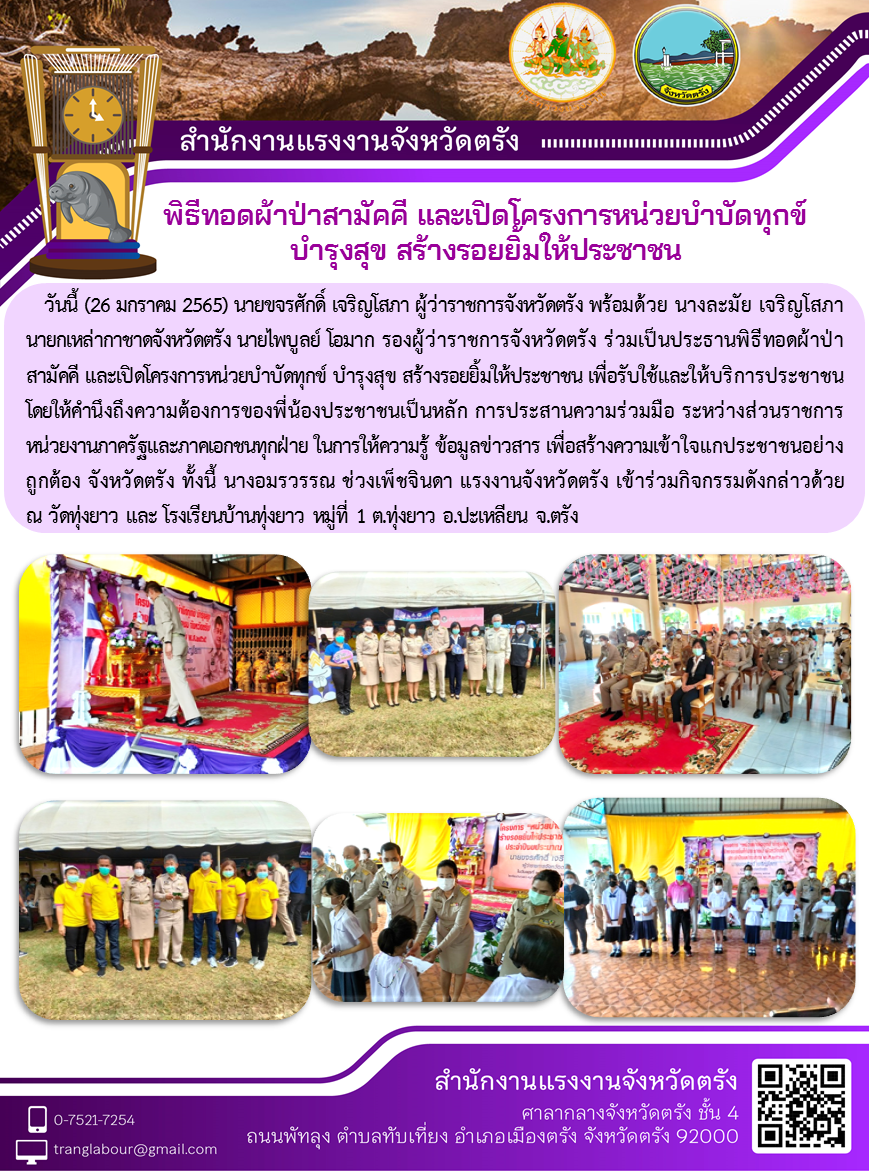 แรงงานจังหวัดตรัง ร่วมพิธีทอดผ้าป่าสามัคคี และเปิดโครงการหน่วยบำบัดทุกข์ บำรุงสุข สร้างรอยยิ้มให้ประชาชน