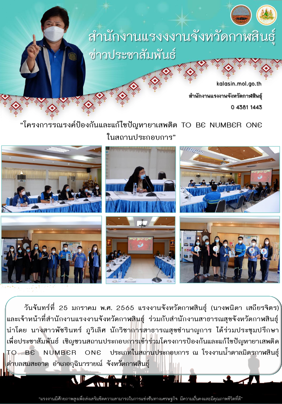 แรงงานจังหวัดกาฬสินธุ์ ลงพื้นที่ประชาสัมพันธ์ เชิญชวน สถานประกอบการเข้าร่วม “โครงการรณรงค์ป้องกันและแก้ไขปัญหายาเสพติด TO BE NUMBER ONE
