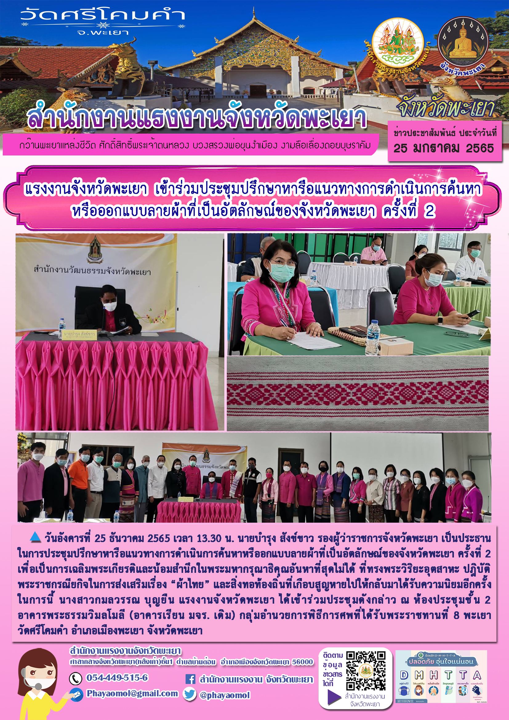 แรงงานจังหวัดพะเยา เข้าร่วมประชุมปรึกษาหารือแนวทางการดำเนินการค้นหาหรือออกแบบลายผ้าที่เป็นอัตลักษณ์ของจังหวัดพะเยา ครั้งที่ 2