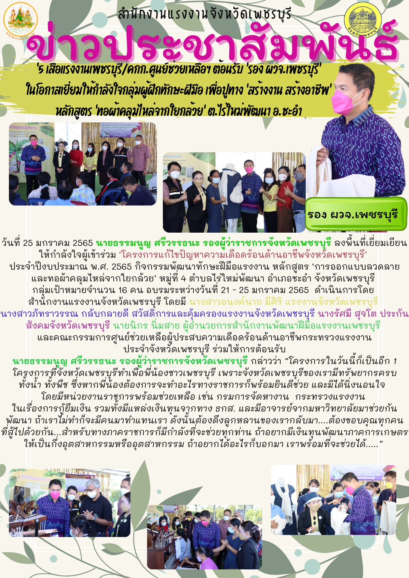 5 เสือแรงงานเพชรบุรี’ ต้อนรับ ‘รอง ผวจ.เพชรบุรี’ ในโอกาสเยี่ยมให้กำลังใจกลุ่มผู้ฝึกทักษะฝีมือ เพื่อปูทาง ‘สร้างงาน สร้างอาชีพ’ หลักสูตร ‘ทอผ้าคลุมไหล่จากใยกล้วย’ ต.ไร่ใหม่พัฒนา อ.ชะอำ