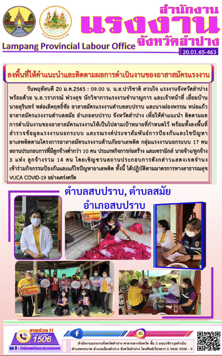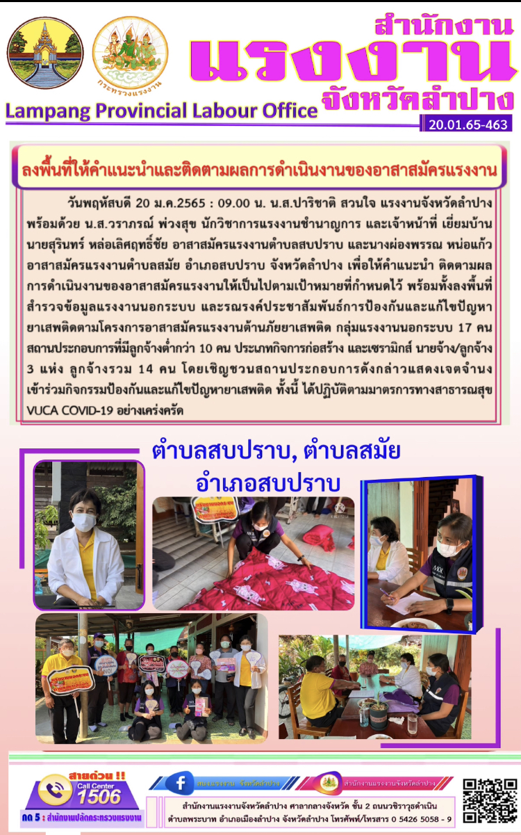 สรจ.ลำปาง ลงพื้นที่ให้คำแนะนำและติดตามผลการดำเนินงานของอาสาสมัครแรงงานอำเภอสบปราบ