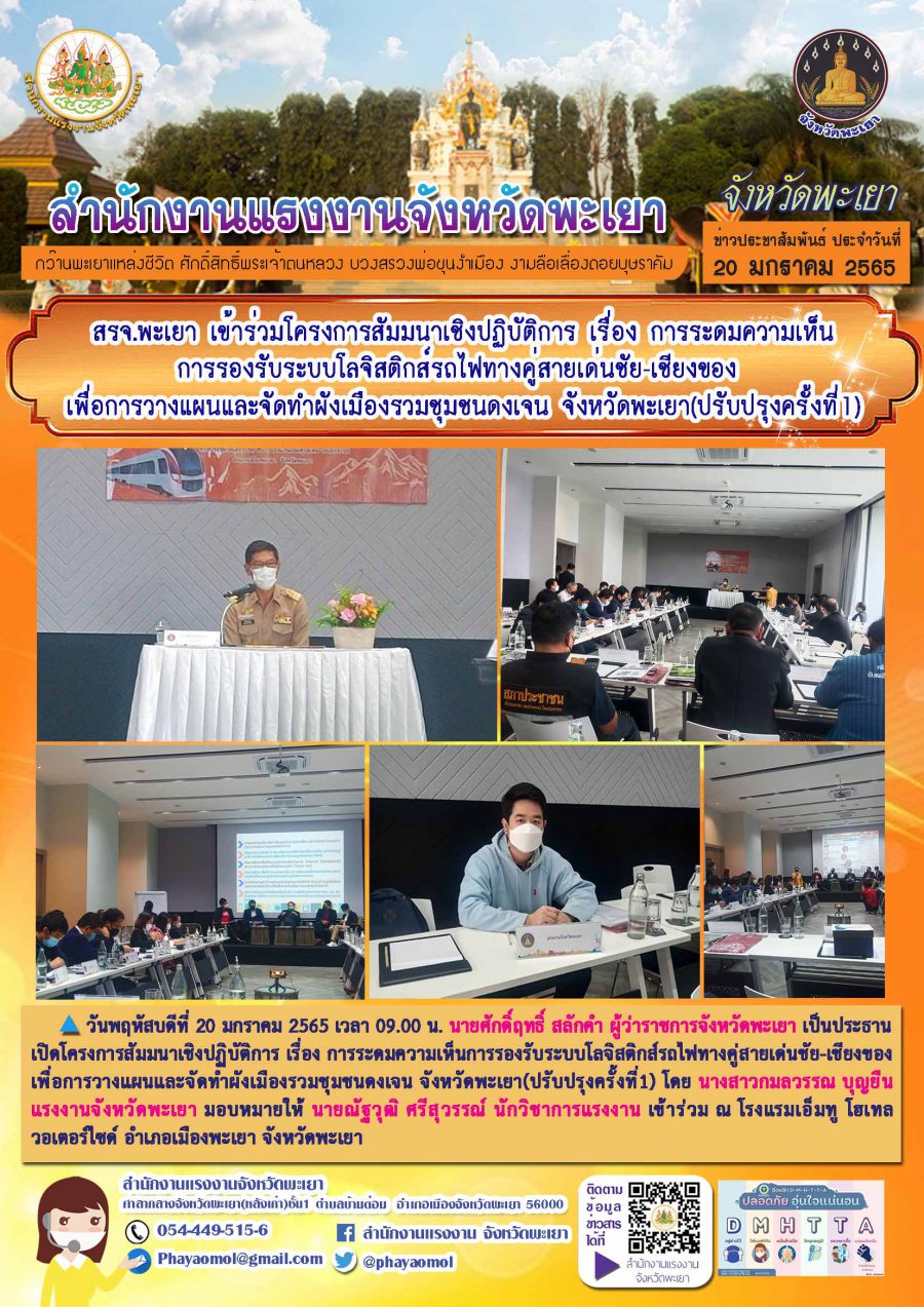 สรจ.พะเยา เข้าร่วมโครงการสัมมนาเชิงปฏิบัติการ เรื่อง การระดมความเห็นการรองรับระบบโลจิสติกส์รถไฟทางคู่สายเด่นชัย-เชียงของ เพื่อการวางแผนและจัดทำผังเมืองรวมชุมชนดงเจน จังหวัดพะเยา(ปรับปรุงครั้งที่1)