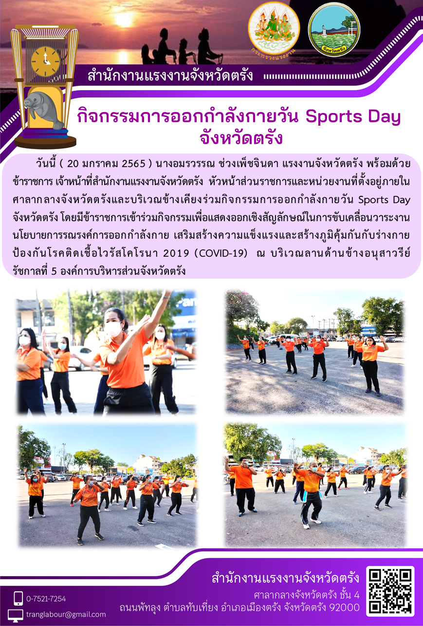 แรงงานจังหวัดตรัง พร้อมด้วย ข้าราชการ เจ้าหน้าที่สำนักงานแรงงานจังหวัดตรัง ร่วมกิจกรรมการออกกำลังกายวัน Sports Day จังหวัดตรัง