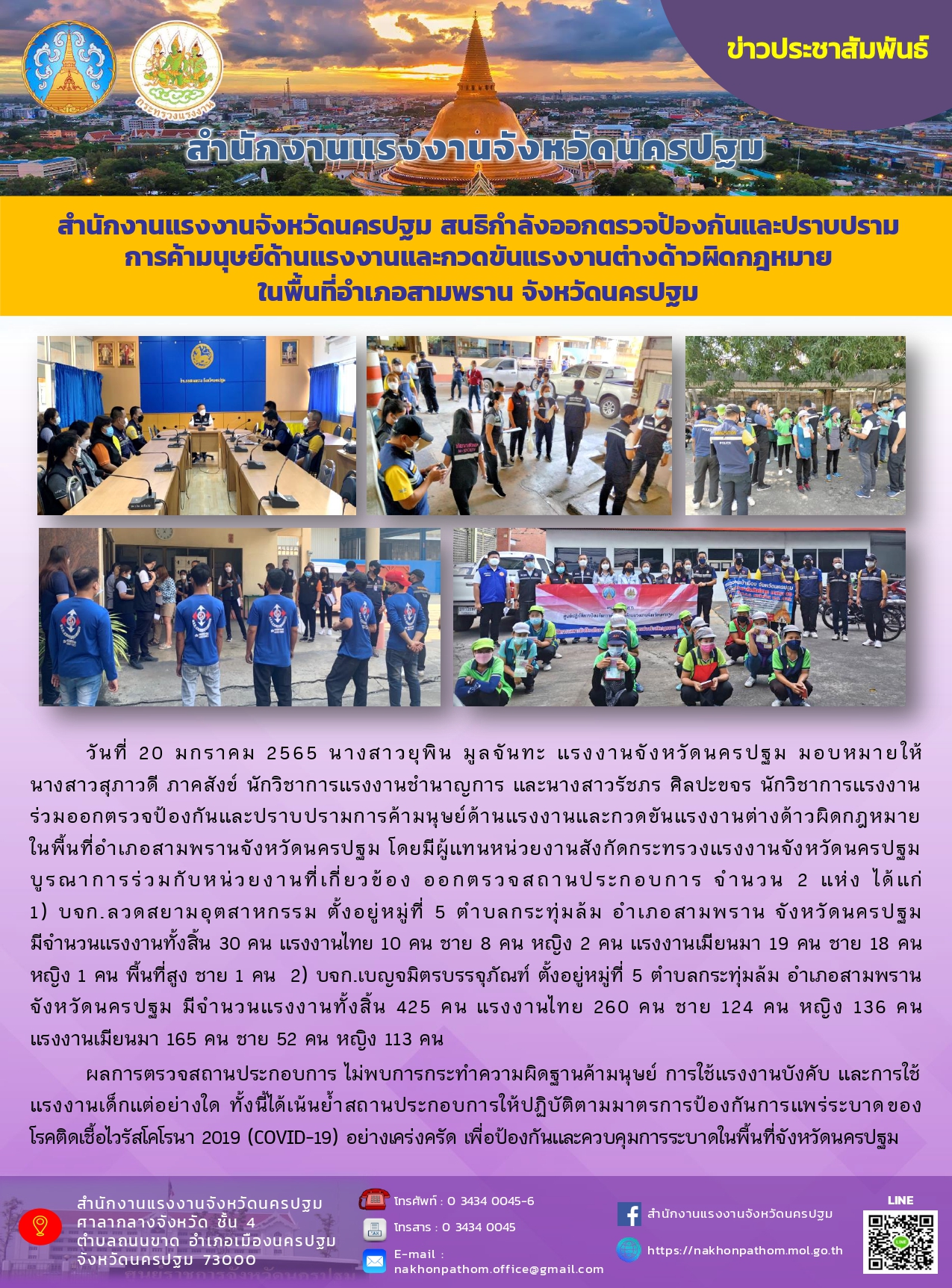 สำนักงานแรงงานจังหวัดนครปฐม สนธิกำลังออกตรวจป้องกันและปราบปรามการค้ามนุษย์ด้านแรงงานและกวดขันแรงงานต่างด้าวผิดกฎหมาย ในพื้นที่อำเภอสามพราน จังหวัดนครปฐม
