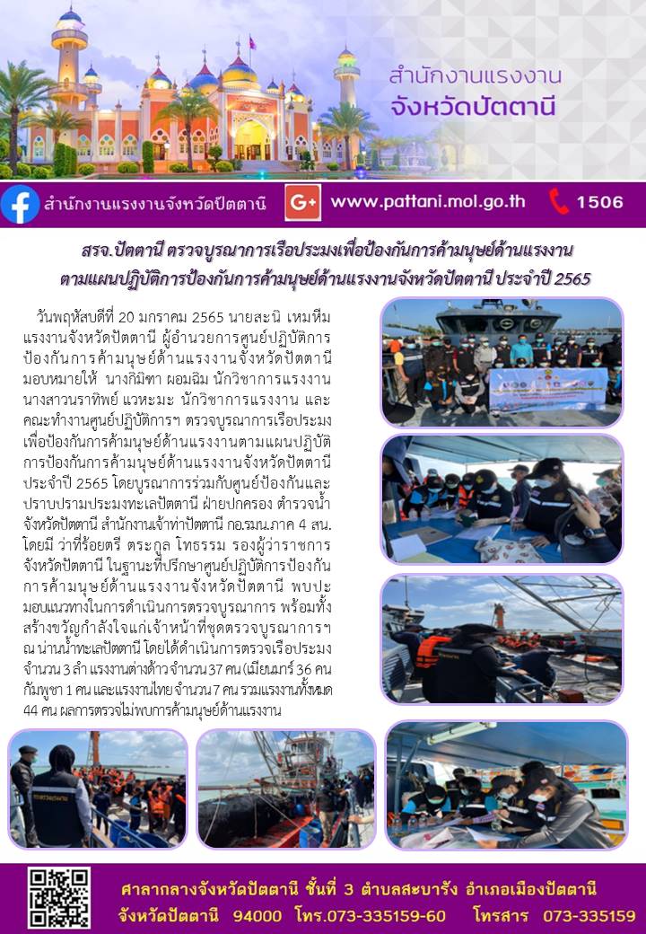 สรจ.ปัตตานี ตรวจบูรณาการเรือประมงเพื่อป้องกันการค้ามนุษย์ด้านแรงงาน ตามแผนปฏิบัติการป้องกันการค้ามนุษย์ด้านแรงงานจังหวัดปัตตานี ประจำปี 2565