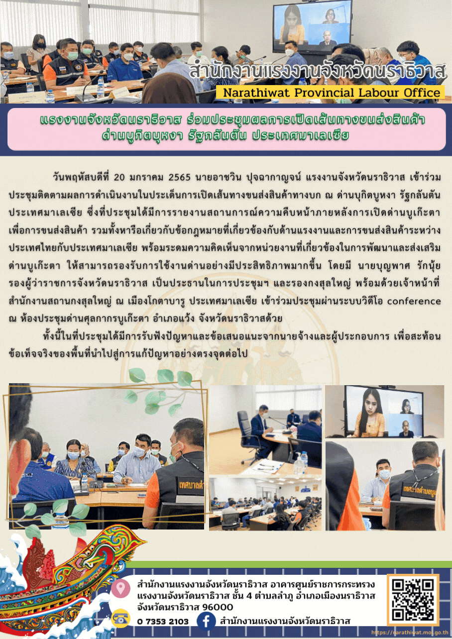 แรงงานจังหวัดนราธิวาส ร่วมประชุมผลการเปิดเส้นทางขนส่งสินค้าด่านบูกิตบุหงา รัฐกลันตัน ประเทศมาเลเซีย