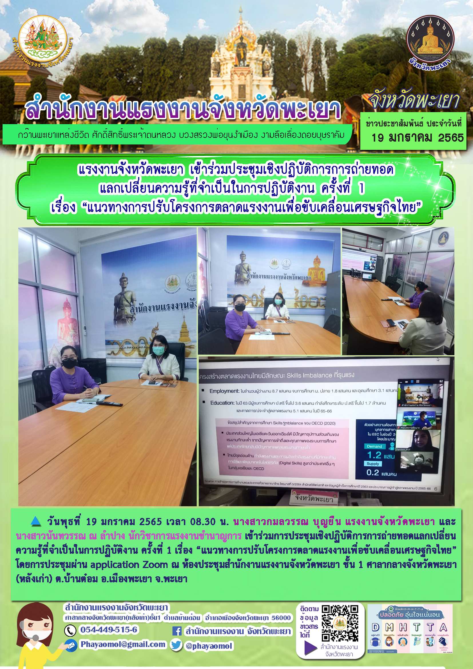 แรงงานจังหวัดพะเยา เข้าร่วมประชุมเชิงปฏิบัติการการถ่ายทอดแลกเปลี่ยนความรู้ที่จำเป็นในการปฏิบัติงาน ครั้งที่ 1 เรื่อง “แนวทางการปรับโครงการตลาดแรงงานเพื่อขับเคลื่อนเศรษฐกิจไทย”