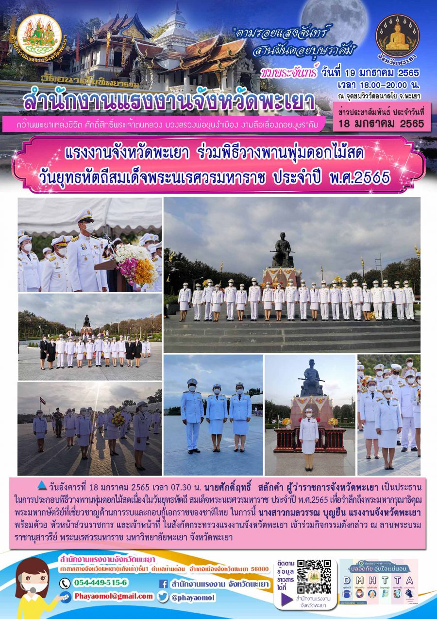 แรงงานจังหวัดพะเยา ร่วมพิธีวางพานพุ่มดอกไม้สด วันยุทธหัตถีสมเด็จพระนเรศวรมหาราช ประจำปี พ.ศ.2565