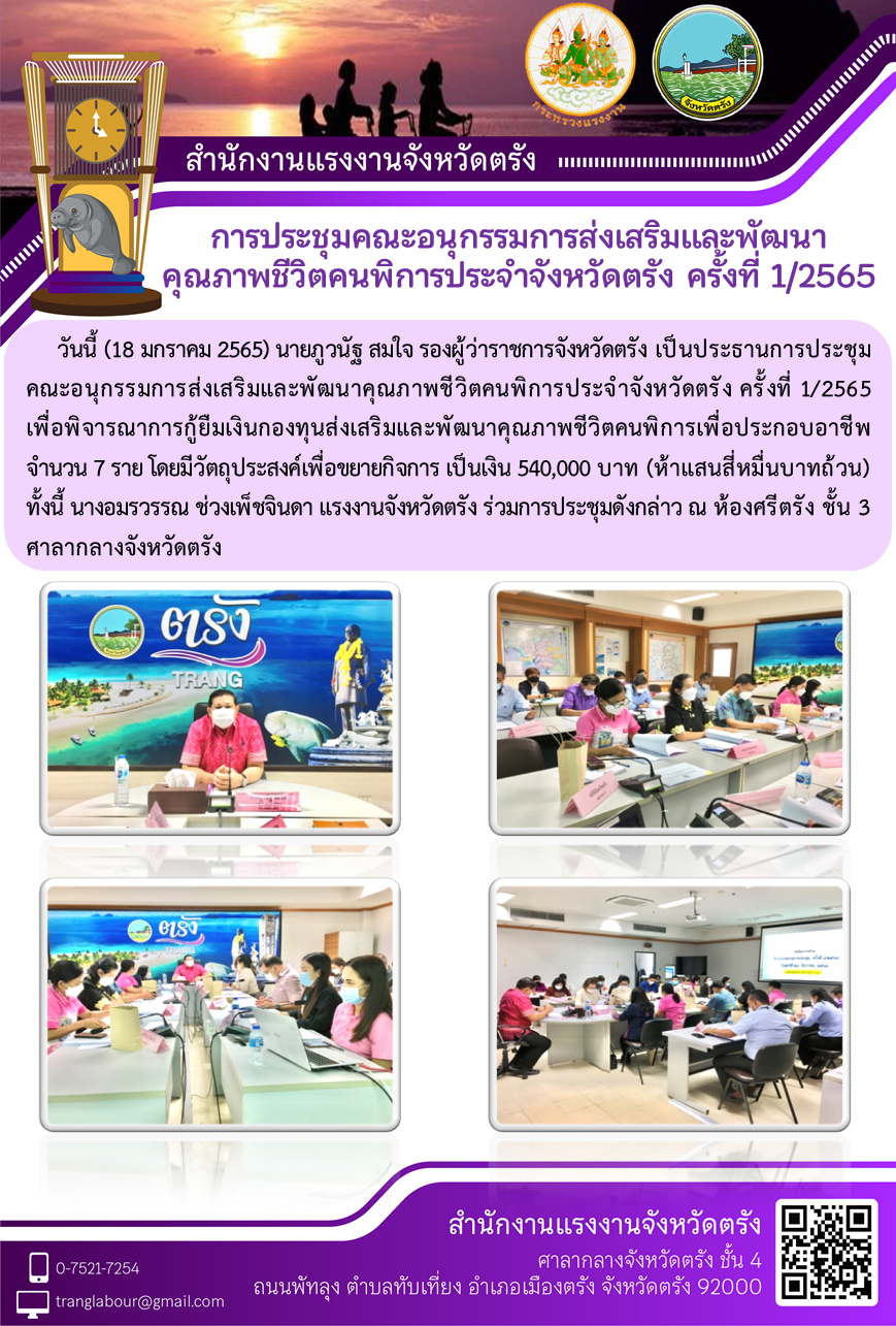 แรงงานจังหวัดตรัง การประชุมคณะอนุกรรมการส่งเสริมและพัฒนาคุณภาพชีวิตคนพิการประจำจังหวัดตรัง ครั้งที่ 1/2565