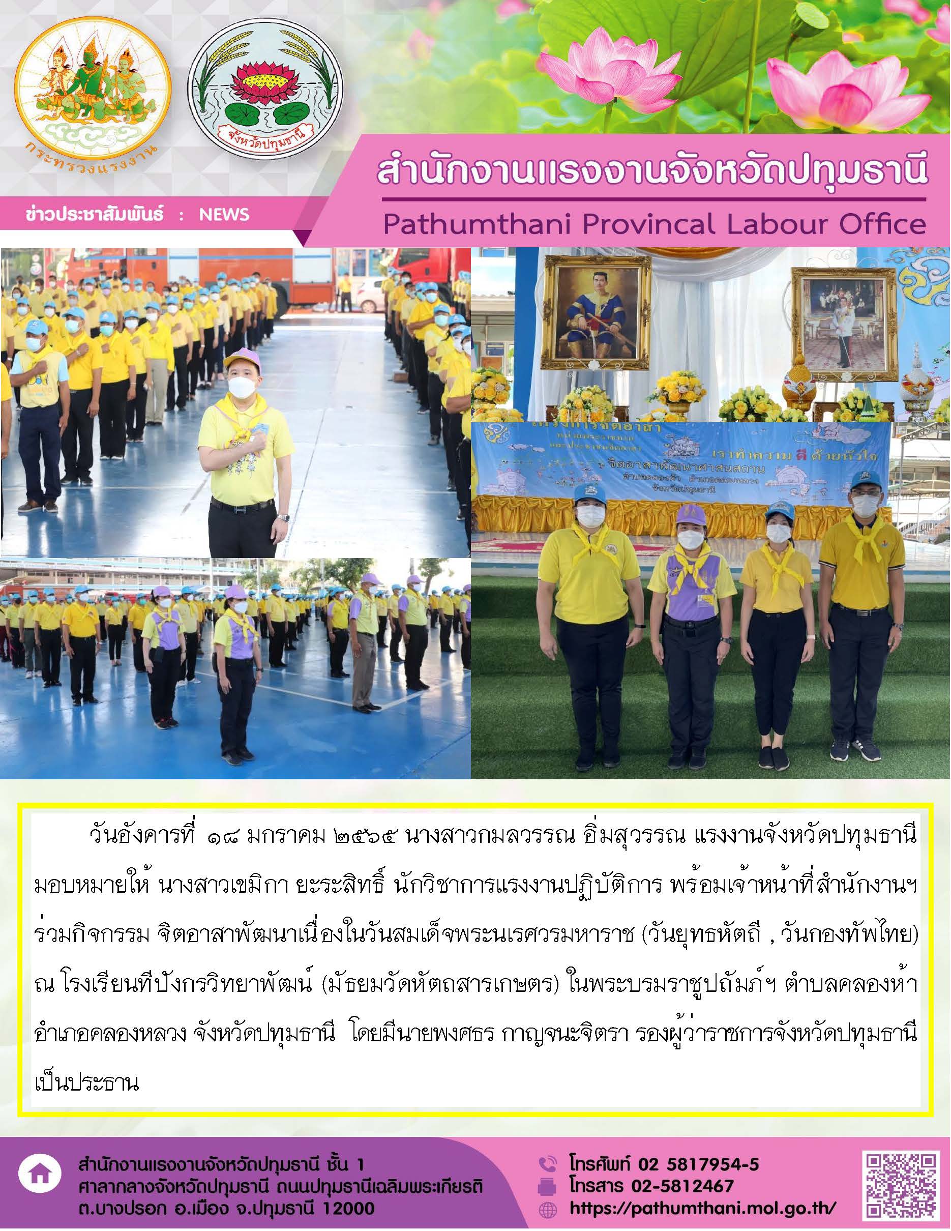 สำนักงานแรงงานจังหวัดปทุมธานี เข้าร่วมกิจกรรมจิตอาสา ”เนื่องในวันสมเด็จพระนเรศวรมหาราช (วันยุทธหัตถี , วันกองทัพไทย)” ณ โรงเรียนทีปังกรวิทยาพัฒน์ (มัธยมวัดหัตถสารเกษตร) ในพระบรมราชูปถัมภ์ฯ อ.คลองหลวง จ.ปทุมธานี