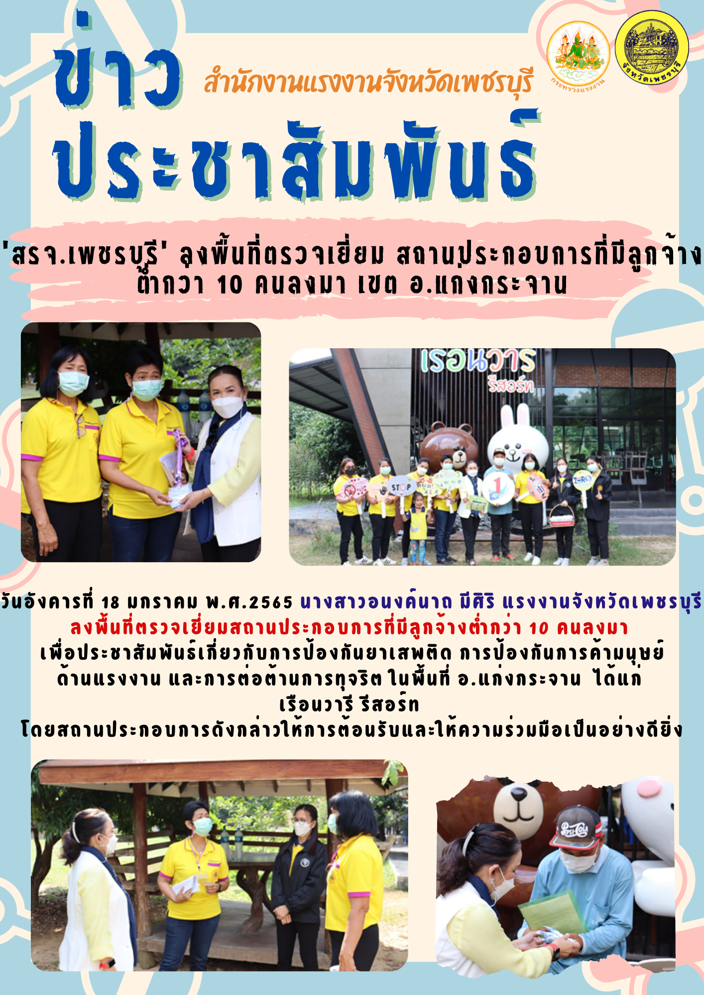 ‘สรจ.เพชรบุรี’ ลงพื้นที่ตรวจเยี่ยมสถานประกอบการที่มีลูกจ้างต่ำกว่า 10 คนลงมา” เขต อ.แก่งกระจาน