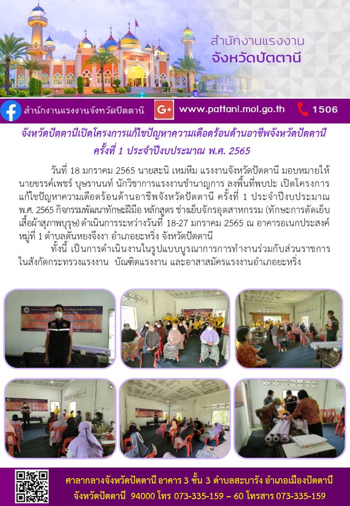 จังหวัดปัตตานีเปิดโครงการแก้ไขปัญหาความเดือดร้อนด้านอาชีพจังหวัดปัตตานี ครั้งที่ 1 ประจำปีงบประมาณ พ.ศ. 2565