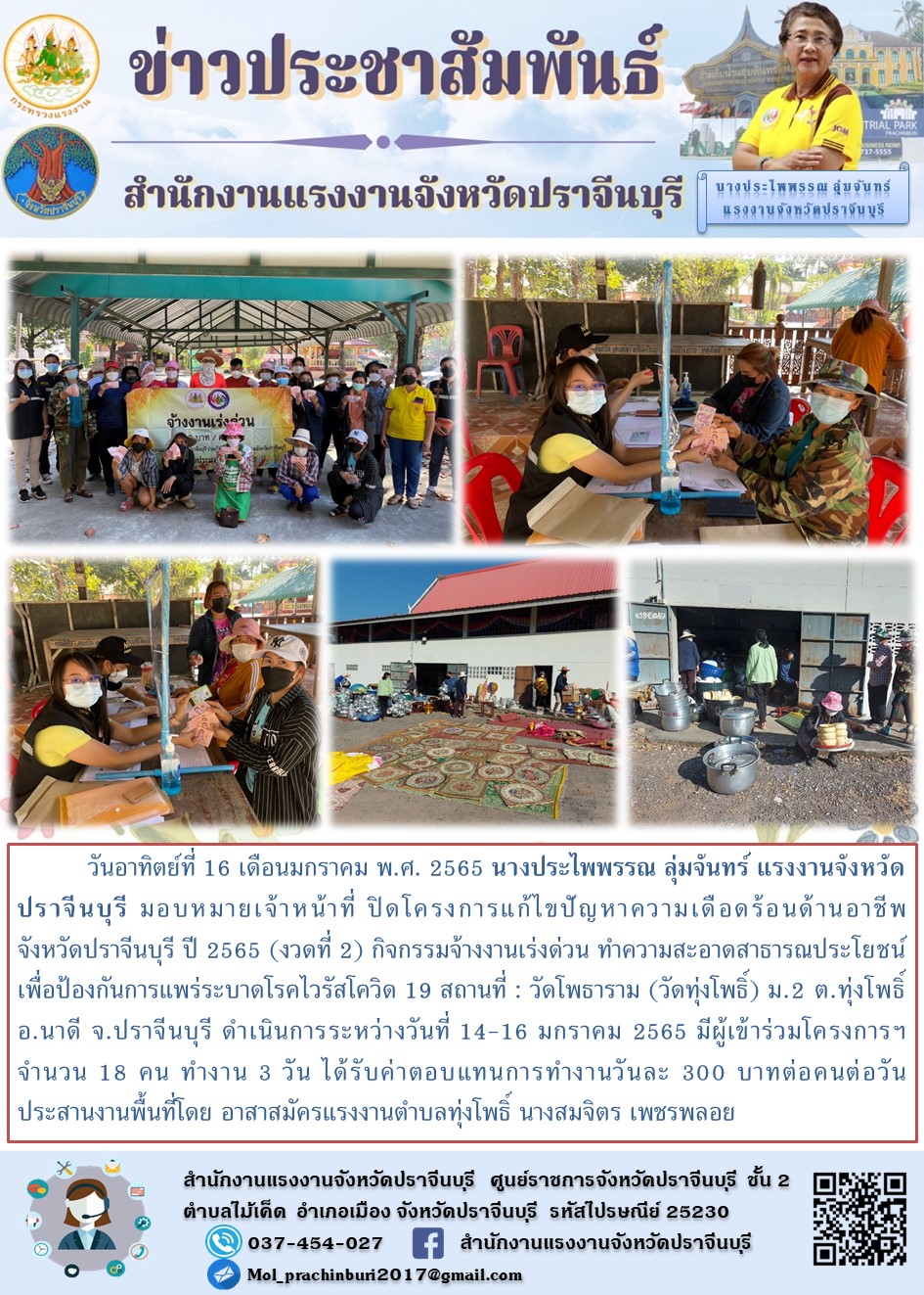 สรจ.ปราจีนบุรี ปิดโครงการแก้ไขปัญหาความเดือดร้อนด้านอาชีพ จังหวัดปราจีนบุรี ปี 2565 กิจกรรมจ้างงานเร่งด่วน วัดโพธาราม (วัดทุ่งโพธิ์)