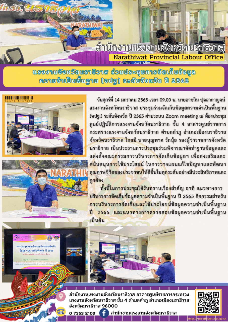 แรงงานจังหวัดนราธิวาส ร่วมประชุมการจัดเก็บข้อมูลความจำเป็นพื้นฐาน (จปฐ) ระดับจังหวัด ปี 2565