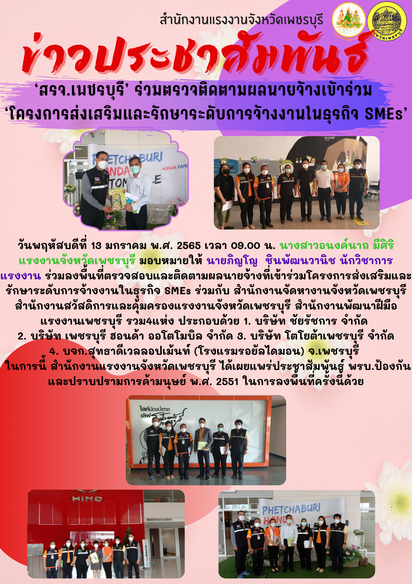 ‘สรจ.เพชรบุรี’ ร่วมตรวจติดตามผลนายจ้างเข้าร่วม ‘โครงการส่งเสริมและรักษาระดับการจ้างงานในธุรกิจ SMEs’