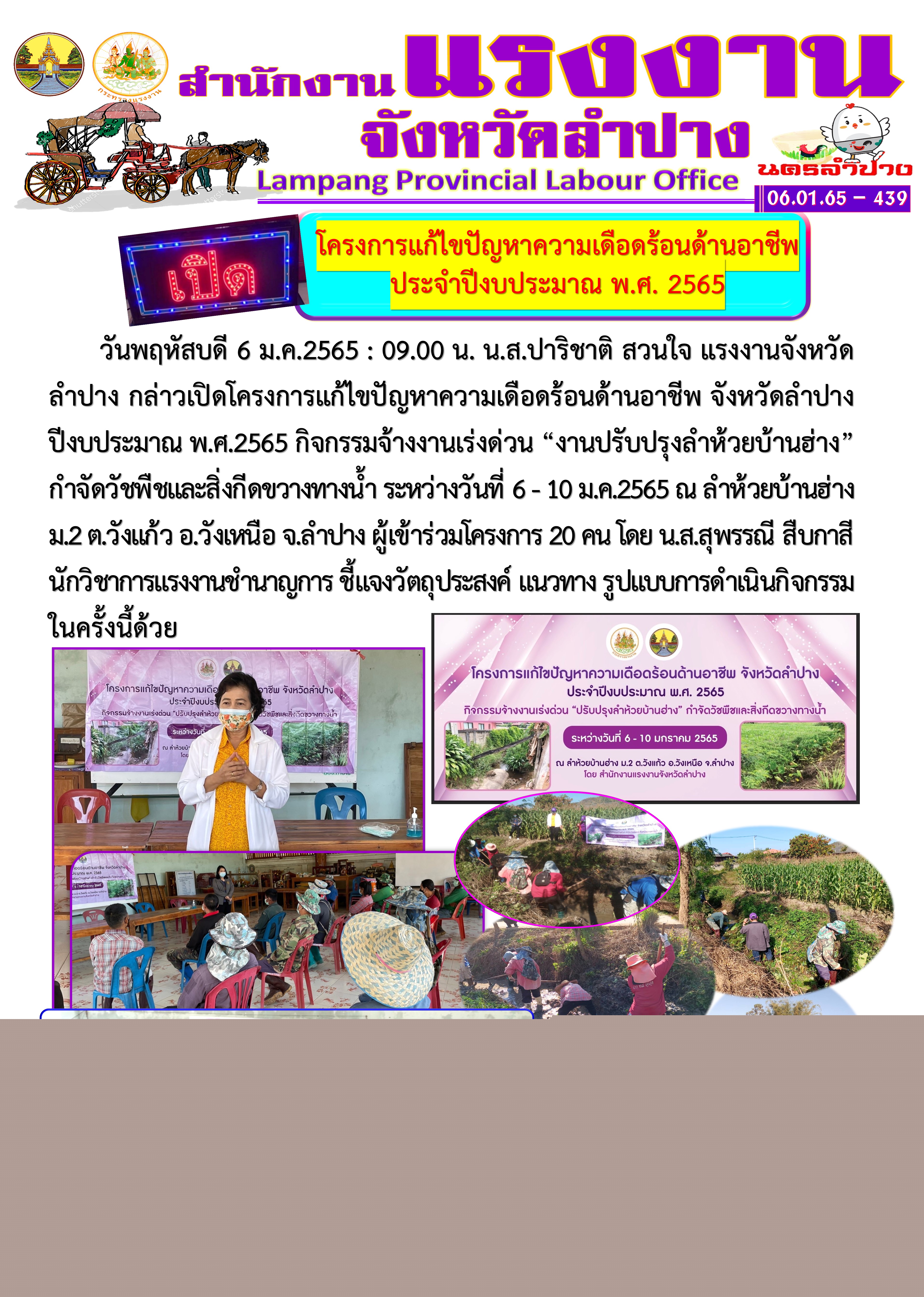 เปิดโครงการแก้ไขปัญหาความเดือดร้อนด้านอาชีพ ประจำปีงบประมาณ พ.ศ. 2565 กิจกรรมจ้างงานเร่งด่วน “งานปรับปรุงลำห้วยบ้านฮ่าง”