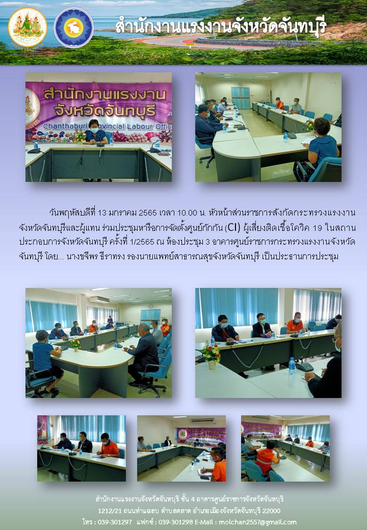 หัวหน้าส่วนราชการสังกัดกระทรวงแรงงานจังหวัดจันทบุรีและผู้แทน ร่วมประชุมหารือการจัดตั้งศูนย์กักกัน (CI) ผู้เสี่ยงติดเชื้อโควิค 19 ในสถานประกอบการจังหวัดจันทบุรี ครั้งที่ 1/2565