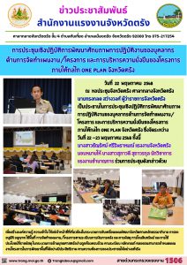 สรจ.ตรัง ร่วมการประชุมเชิงปฏิบัติการพัฒนาศักยภาพการปฏิบัติงานของบุคลากรด้านการจัดทำแผนงาน/โครงการ และการบริหารความยั่งยืนของโครงการ ภายใต้กลไก One Plan จังหวัดตรัง