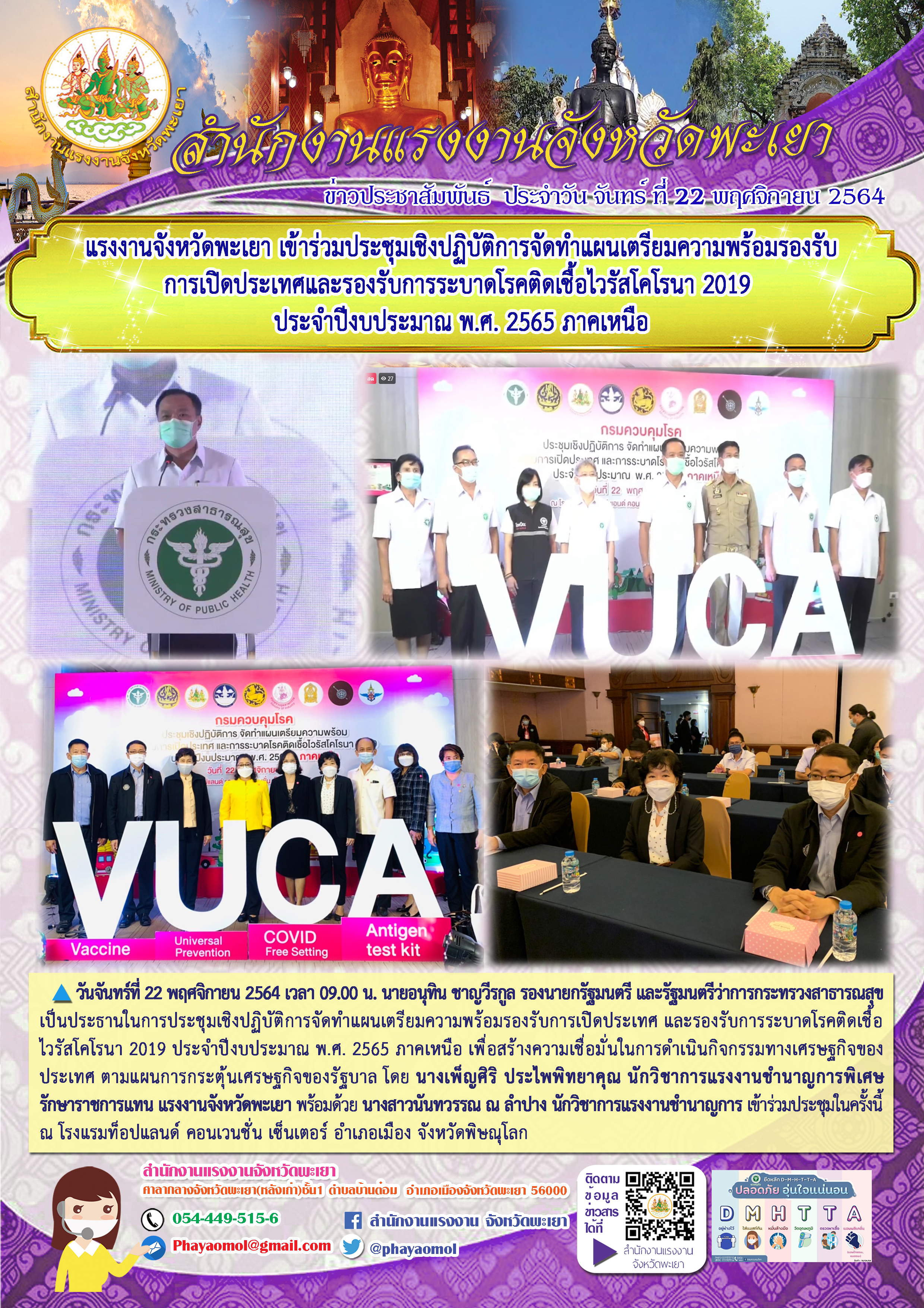 แรงงานจังหวัดพะเยา เข้าร่วมประชุมเชิงปฏิบัติการจัดทำแผนเตรียมความพร้อมรองรับการเปิดประเทศและรองรับการระบาดโรคติดเชื้อไวรัสโคโรนา 2019 ประจำปีงบประมาณ พ.ศ. 2565 ภาคเหนือ