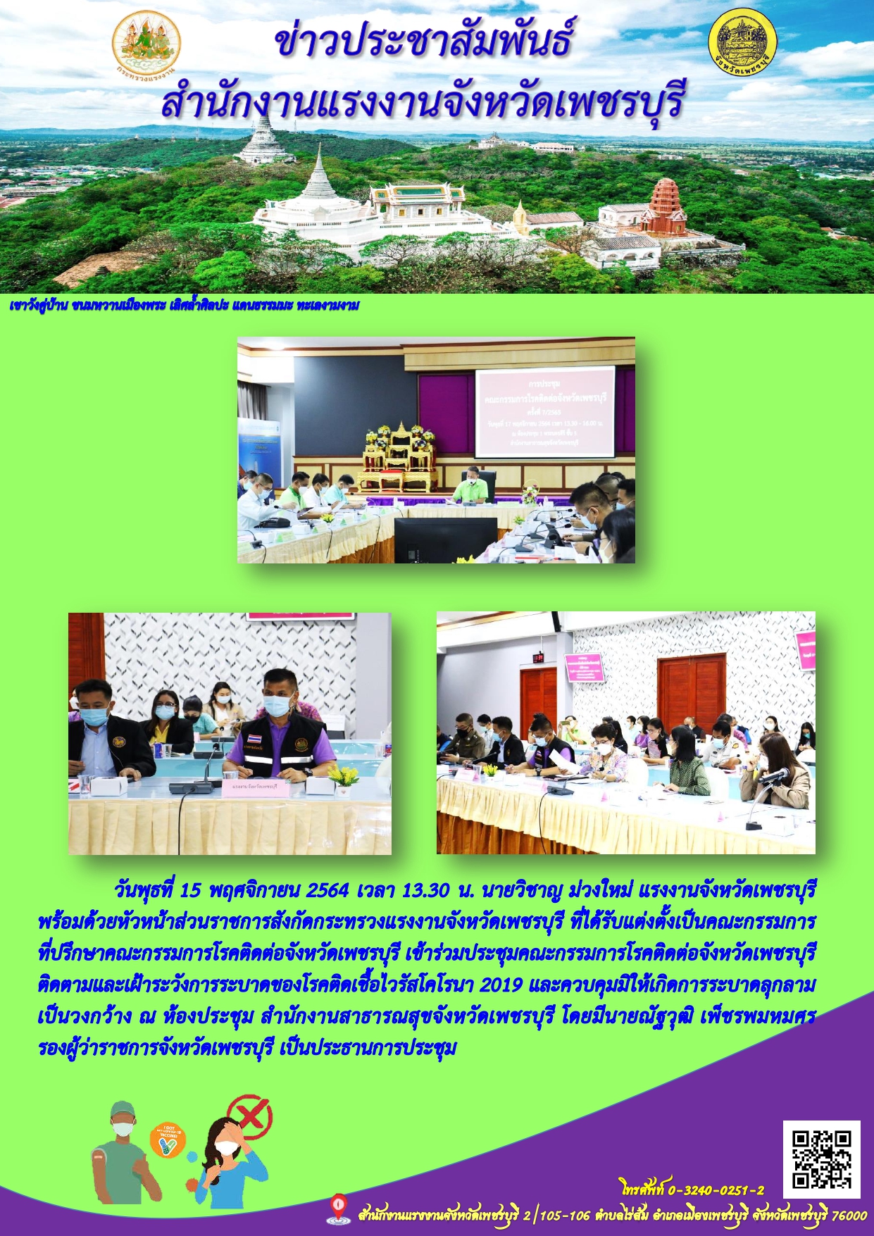 หัวหน้าส่วนราชการสังกัดกระทรวงแรงงานจังหวัดเพชรบุรี ที่ได้รับแต่งตั้งเป็นคณะกรรมการ ที่ปรึกษาคณะกรรมการโรคติดต่อจังหวัดเพชรบุรี เข้าร่วมประชุมคณะกรรมการโรคติดต่อจังหวัดเพชรบุรี ติดตามและเฝ้าระวังการระบาดของโรคติดเชื้อไวรัสโคโรนา 2019