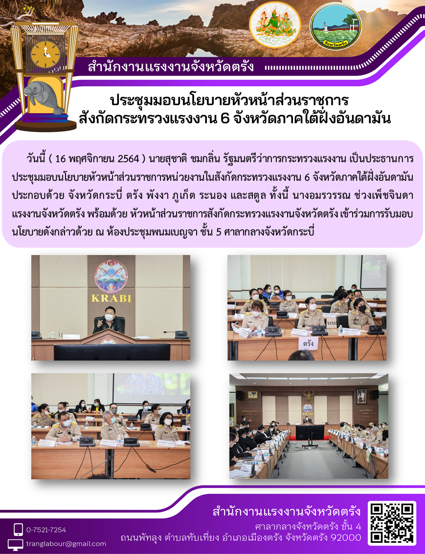 แรงงานจังหวัดตรัง ร่วมประชุมมอบนโยบายหัวหน้าส่วนราชการหน่วยงานในสังกัดกระทรวงแรงงาน 6 จังหวัดภาคใต้ฝั่งอันดามัน ณ ห้องประชุมพนมเบญจา ชั้น 5 ศาลากลางจังหวัดกระบี่
